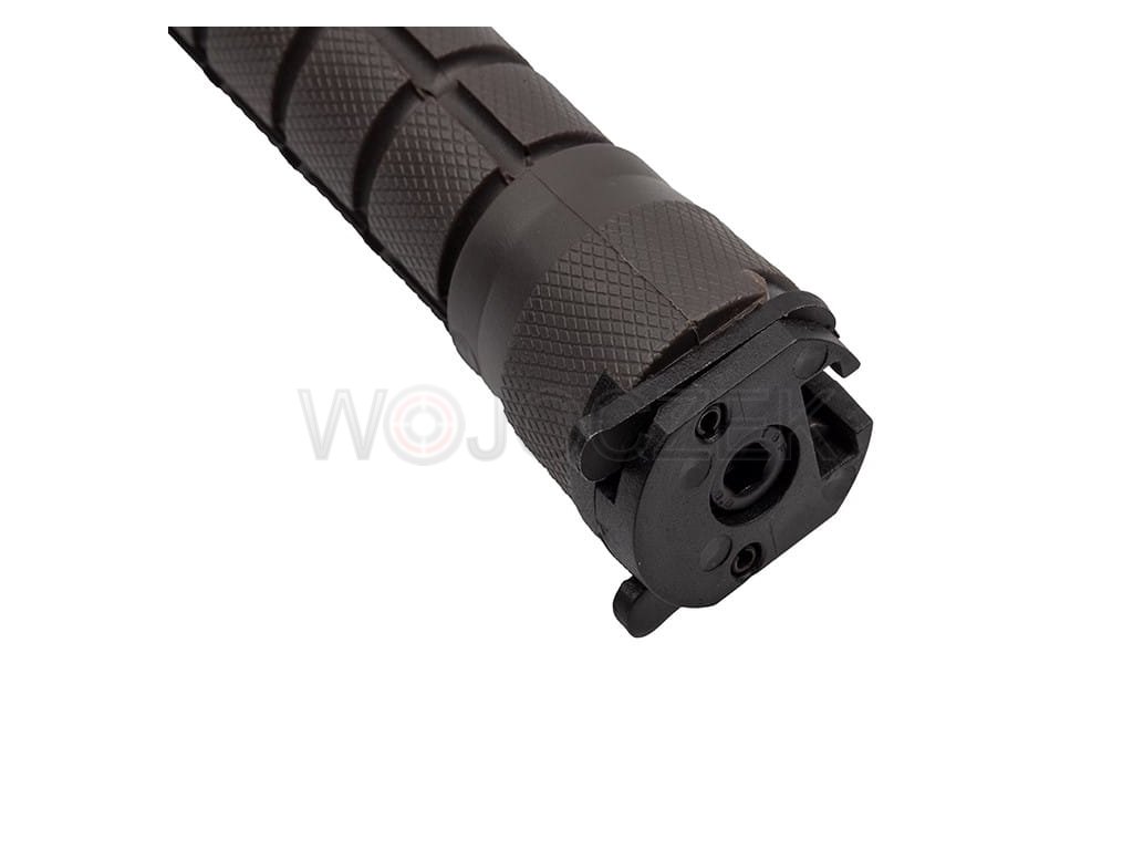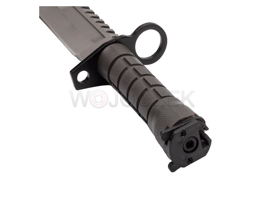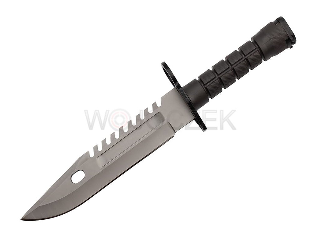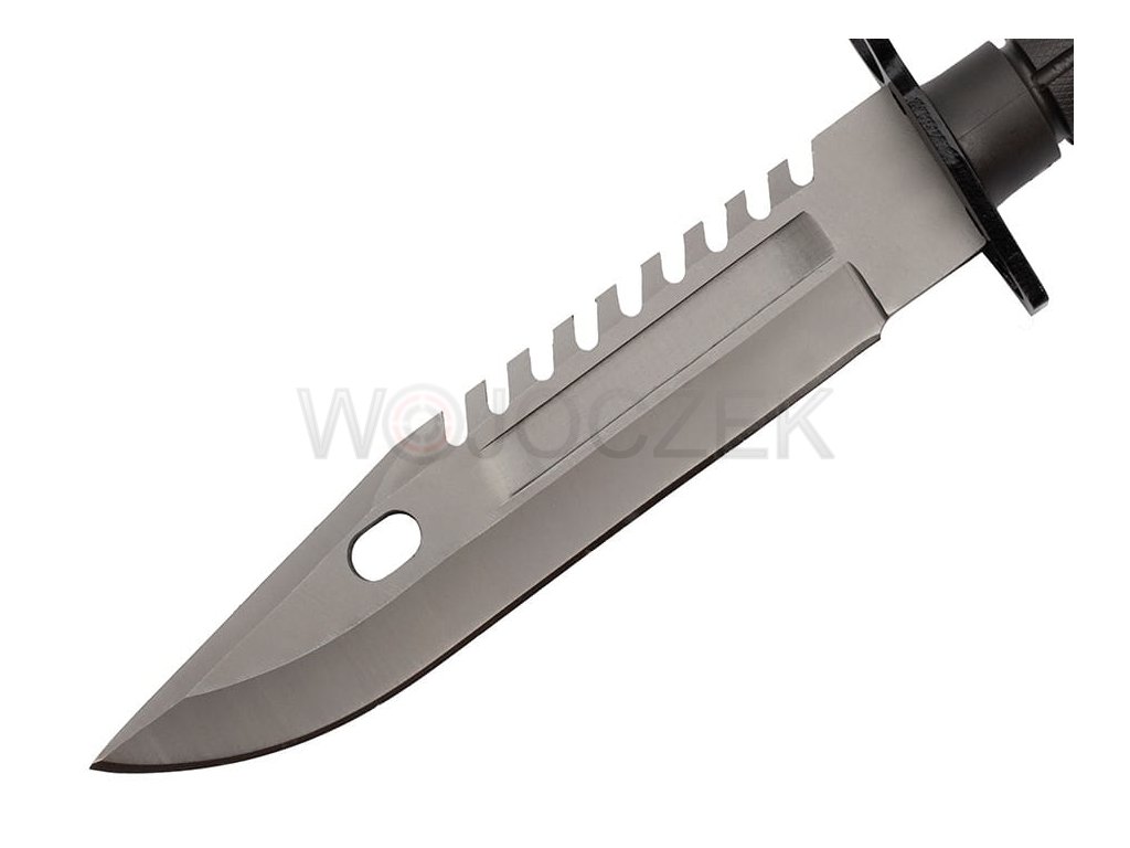 BAJONET US ARMY M9 - MODEL N-715B Dokonalá replika ikonického amerického bajonetu M9. Dokonalá reprodukce v kombinaci s robustní a odolnou konstrukcí činí bajonet neuvěřitelně odolným. Klasická čepel s klipem je vyrobena z vysoce kvalitní nerezové oceli 420 a je potažena ochranným povlakem, který chrání nůž před korozí a odlesky. Čepel má hladkou čepel, ideální pro podmínky přežití, a pilku na hřbetu. Ergonomická rukojeť z oceli potažené protiskluzovým materiálem je vhodná pro ty nejnáročnější podmínky. Tento vojenský nůž bezpečně padne do ruky a zajišťuje pohodlí i při delší a těžší práci. Široký kovový chránič chrání ruku před sklouznutím směrem k ostří. Nůž je vybaven klasickým mechanismem pro uchycení pušky s bajonetem M9 a ochranným kroužkem pro uchycení k hlavni. Toto multifunkční pouzdro slouží nejen jako pochva, ale v kombinaci s nožem vytváří také štípačky na drát. Na přední straně se nachází kapsa na patentní zapínání, zatímco na zadní straně je skrytý brousek. Pouzdro se připevňuje k opasku kovovou sponou a praktická, široká přezka umožňuje jeho odepnutí spolu s nožem. Tento plně funkční bajonet M9 je krásným dárkem pro každého vojenského nadšence.