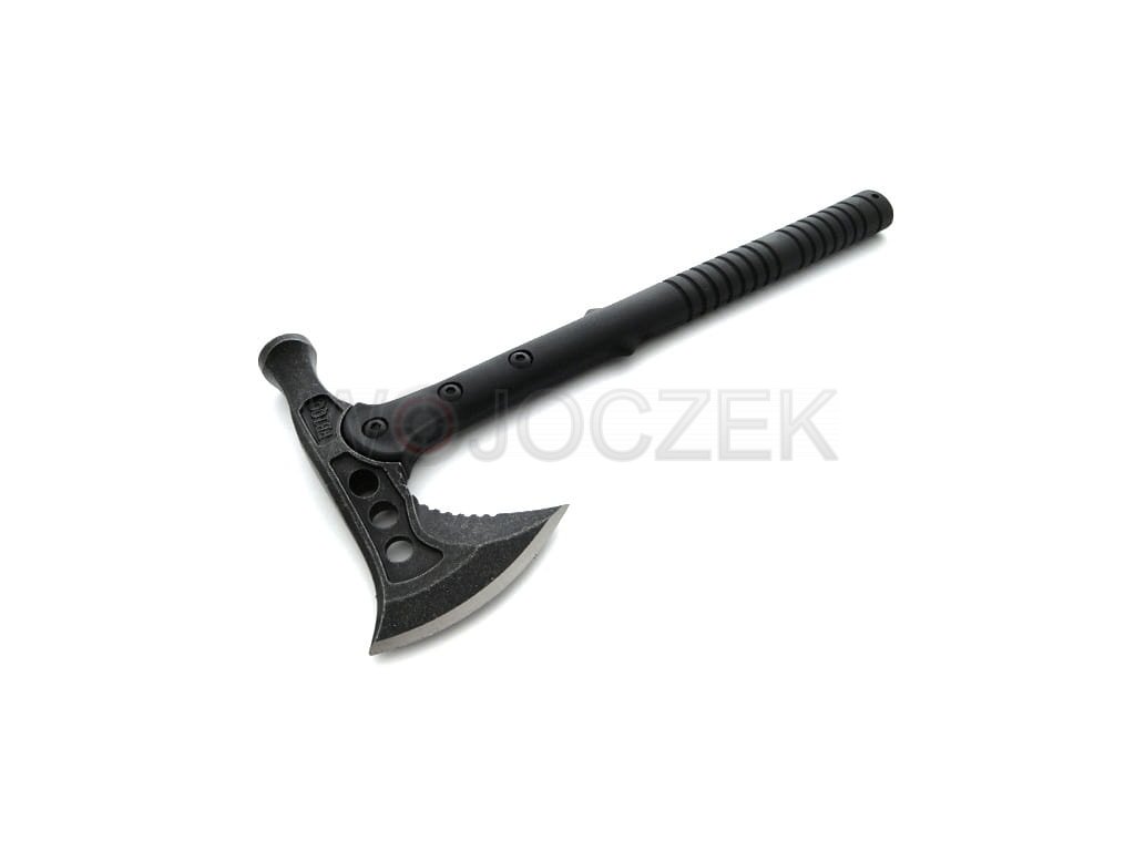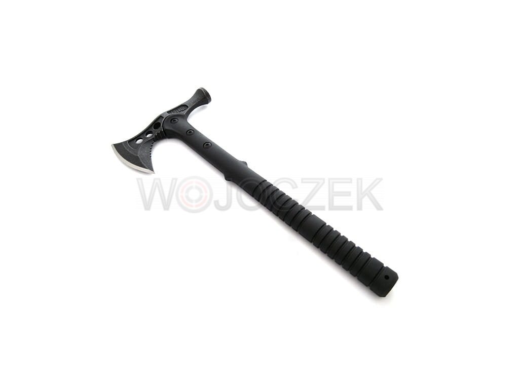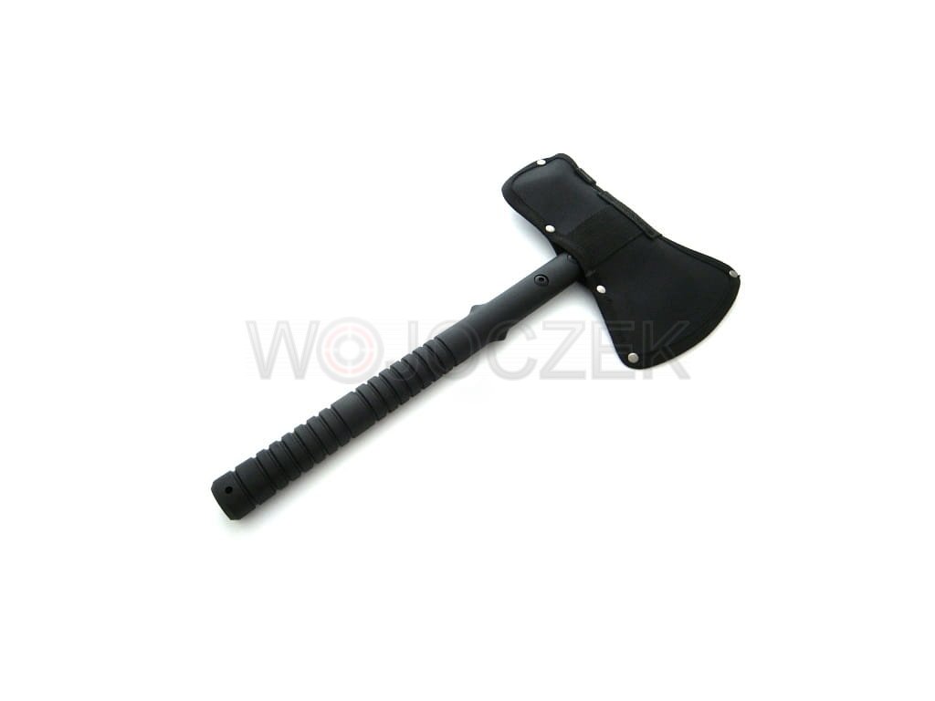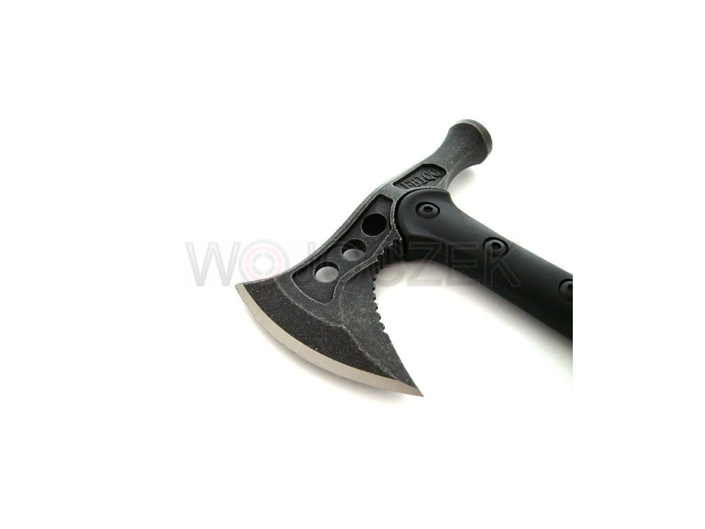 The head is made of extremely resistant and high-grade 440 stainless steel. This material is additionally coated with a layer of coating in "stone wash" color, which not only gives it aesthetic value, but also effectively protects it from corrosion, and the user from the glare effect. The comfortable, notched handle was made of resistant ABS plastic, which has anti-slip properties, extremely important during bad weather conditions. The whole thing has been connected by three solid screws. The black survival axe is perfectly balanced. This allows you to make precise sweeps without straining your hands or muscles. The axe comes with a blade pouch, which can be attached to a trouser belt or equipments. There is a hole in the back for tying a rope or string.