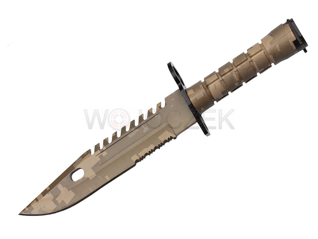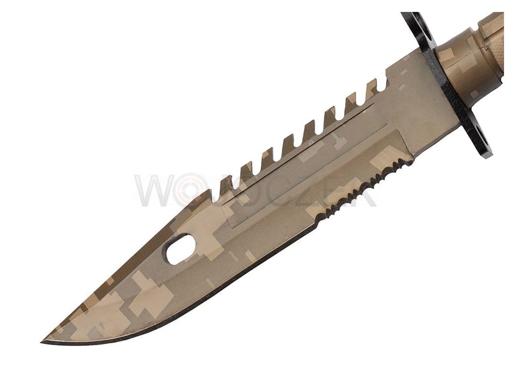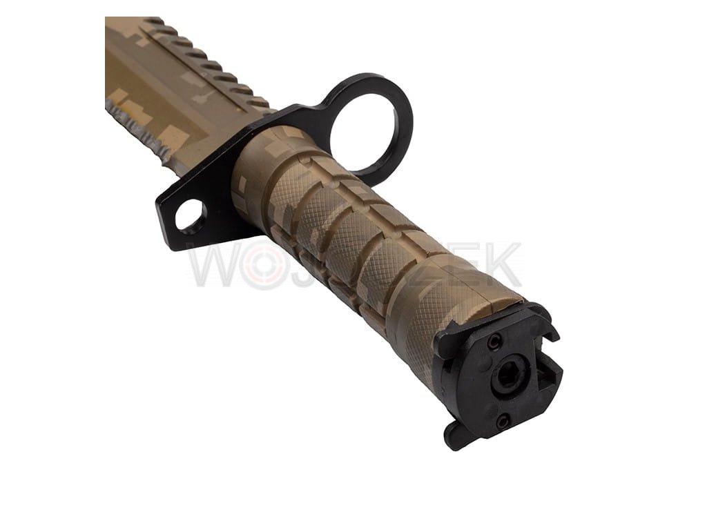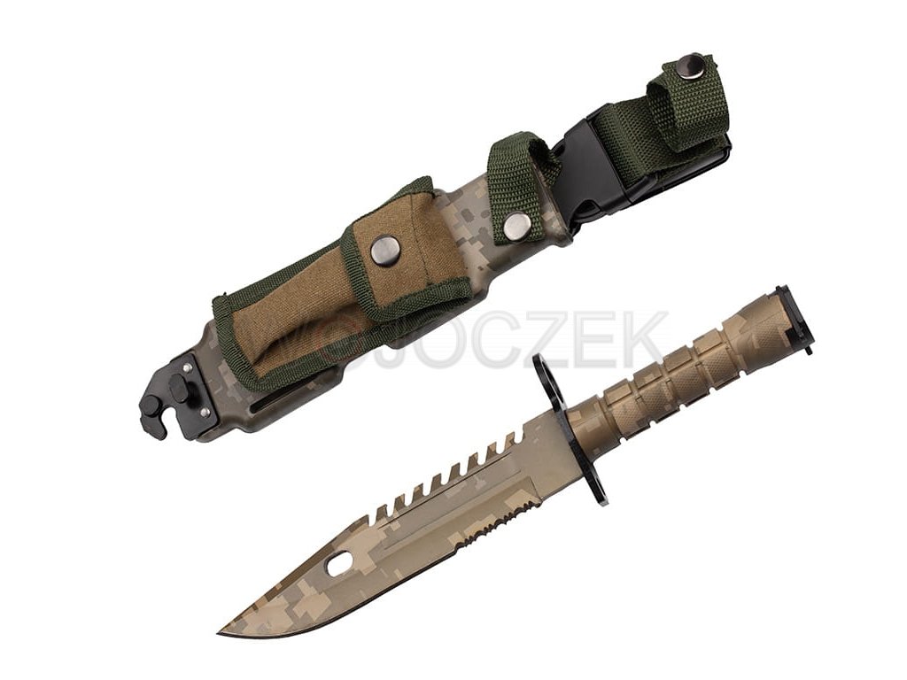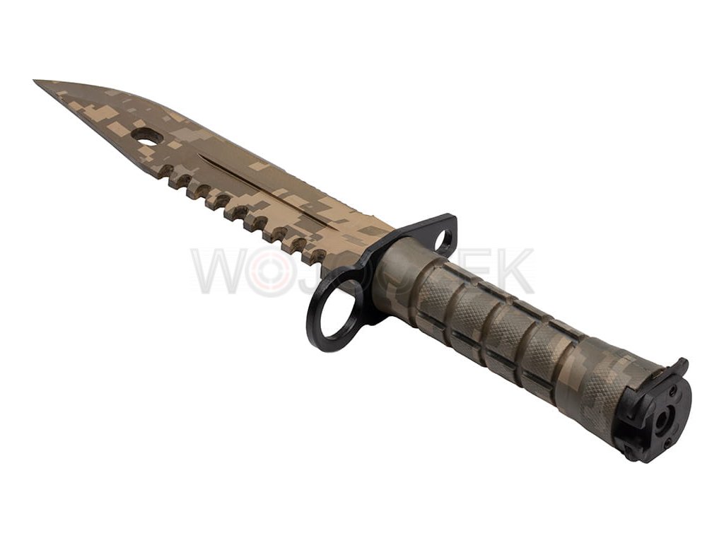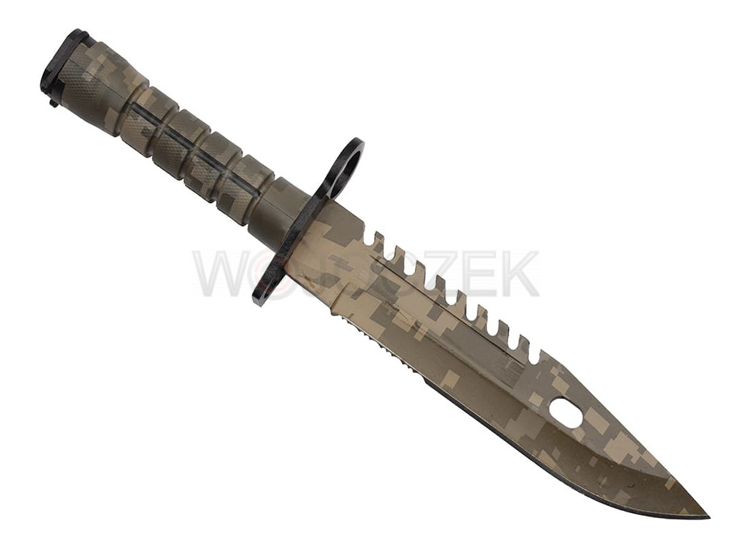 M9 US ARMY CAMO BAYONET - MODEL N-715D The best replica of the iconic American M9 bayonet in camo version. Solid and strong construction combined with perfect mapping guarantee that the bayonet is incredibly durable. The model blade with a clip point profile is made of high-quality 420 stainless steel, covered with an additional camo-colored coating that protects the knife from corrosion and possible glare. The blade has a smooth and partially serrated blade to enable any type of cut. In addition, there is a functional ball on the back. The ergonomic handle is made of steel coated with a plastic that has non-slip properties even in the worst conditions. The military bayonet lies securely and comfortably in the hand, guaranteeing comfortable work even after a long time. A wide, metal crossguard protects the hand against undesirable slipping towards the blade. As standard for this model, the bayonet has a mechanism for attaching to the rifle and a ring that allows the handguard to be put on the barrel. The set includes a multifunctional holster, which in combination with a knife creates wire cutters. There is a zippered pocket on the front and a small, functional whetstone on the back. The holster is attached to the belt with a metal clip, and a wide, comfortable buckle allows you to detach it with the knife. The M9 bayonet in the camo version will be a beautiful gift for every military fan.