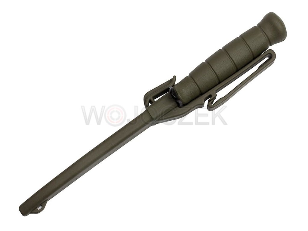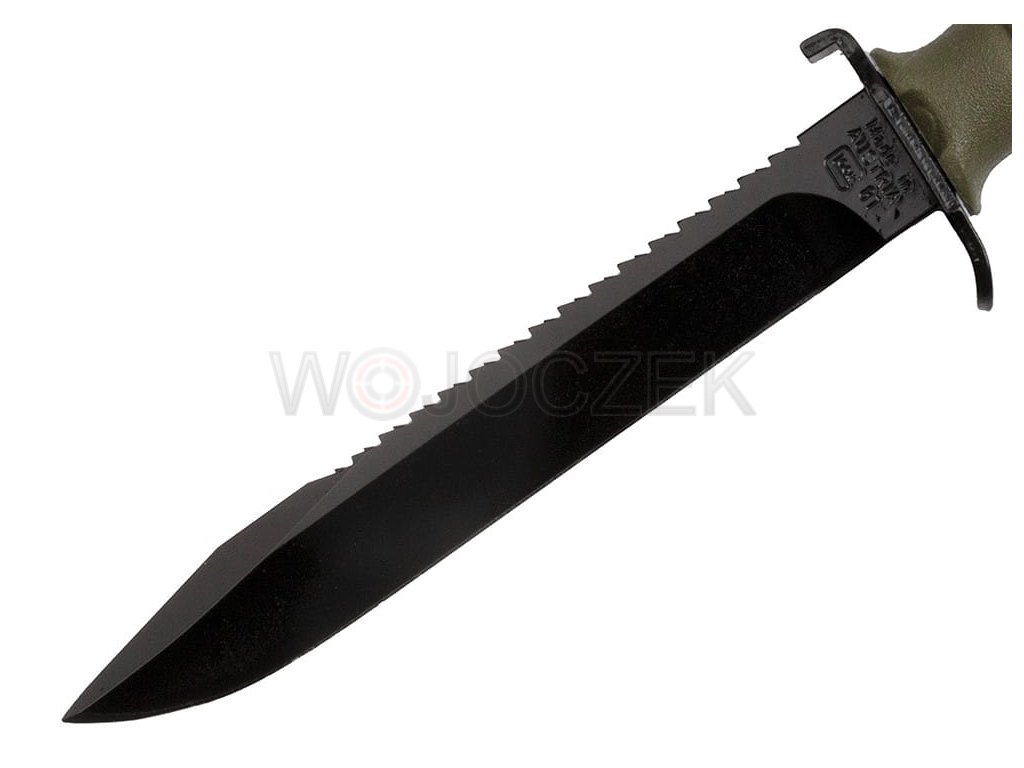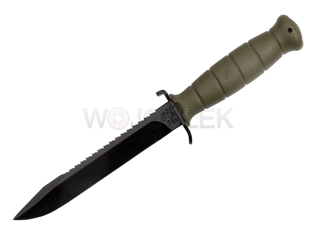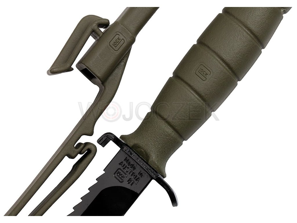GLOCK 81 GREEN ASSAULT KNIFE. The Glock series of knives was developed in 1975 by the Austrian company Glock. Just a year later, in 1976, it became the official assault knife of the Austrian army. To this day, it continues to be used by many units around the world (including the Polish army). Today, as a legend, it is eagerly purchased by soldiers and civilians alike. The Glock 81 is simple in design, well-balanced, and extremely durable. The blade is made of thick, blackened stainless steel. On the top of the blade is a highly effective double-row saw, allowing it to cut even thick branches. The handle is made of a hard polymer, the same one used to manufacture Glock pistols. A metal guard protects the hand from uncontrolled slipping onto the blade. One side of the guard serves as a bottle opener. The sheath is made of the same polymer as the handle. It has a strong clip that prevents the knife from slipping out. The belt clasp is designed for quick fastening without having to thread it through the entire belt. Recommended for survival trips and collectors.
