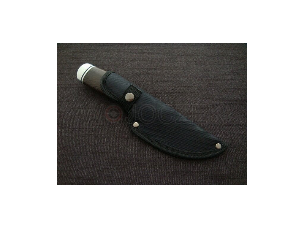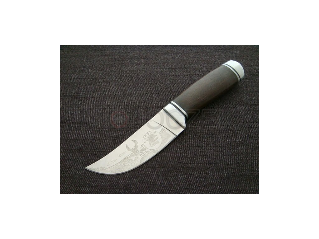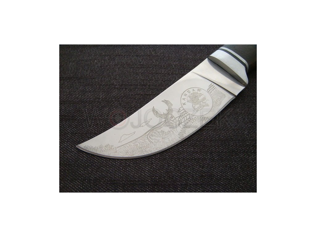 KANDAR HUNTING KNIFE N-1581 A hunting knife with a beautifully decorated blade, straight from the renowned Kandar brand. It will be a great and necessary tool on any trip, camping, hunting or other outdoor activities. Its extremely solid Hidden Tang construction provides maximum resistance to possible damage. The blade with a classic trialing point profile is made of high-quality 440 stainless steel. The blade has a one-sided, precise engraving depicting a deer on a rut. The very comfortable handle made of natural wood fits perfectly in the hand. It allows for a firm and strong grip, extremely useful during harder work in the forest. A small metal crossguard will effectively stop the hand from sliding towards the blade. The Kandar hunting knife is equipped with a black, classic Cordura sheath that can be attached to the trouser belt. Technical data: Knife type: with a fixed blade Blade profile: trialing point Blade type: smooth Overall length: 230 mm Blade length: 110 mm Handle length: 120 mm Blade width: 34 mm Blade thickness: 3.8 mm Weight: 144 g Blade material : stainless steel 440 Handle material: wood + metal Cover: yes, cordura Hidden Tang construction Manufacturer: Kandar Country of origin: PRC