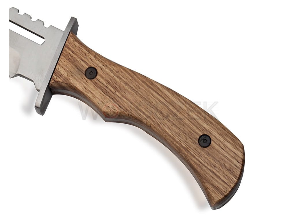 HUNTING KNIFE - MACHET 40 CM N-631B Great, powerful and extremely solid hunting knife - machete. Its extremely reliable Full Tang construction guarantees great strength and resistance to possible damage. The massive monolith that runs the entire length of the knife is made of high-quality 440 stainless steel, which is easy to sharpen. The blade with a modified, extended clip point profile is sharp and is great not only for cutting, but also for chopping and grubbing. On the back, the hunting knife has numerous notches, which is a universal, functional saw. The very comfortable and handy handle is made of natural wood. Thanks to it, despite its weight, the knife lies perfectly in the hand, allowing for a firm grip and a strong swing. The hunting knife has a fairly wide crossguard, which effectively protects the hand from slipping towards the cutting edge. The set includes a classic, black cordura holster that can be attached to the trouser belt. A powerful knife - a machete is the perfect tool for cutting, chopping and grubbing, it can easily handle grass, branches, trees, shrubs, etc.