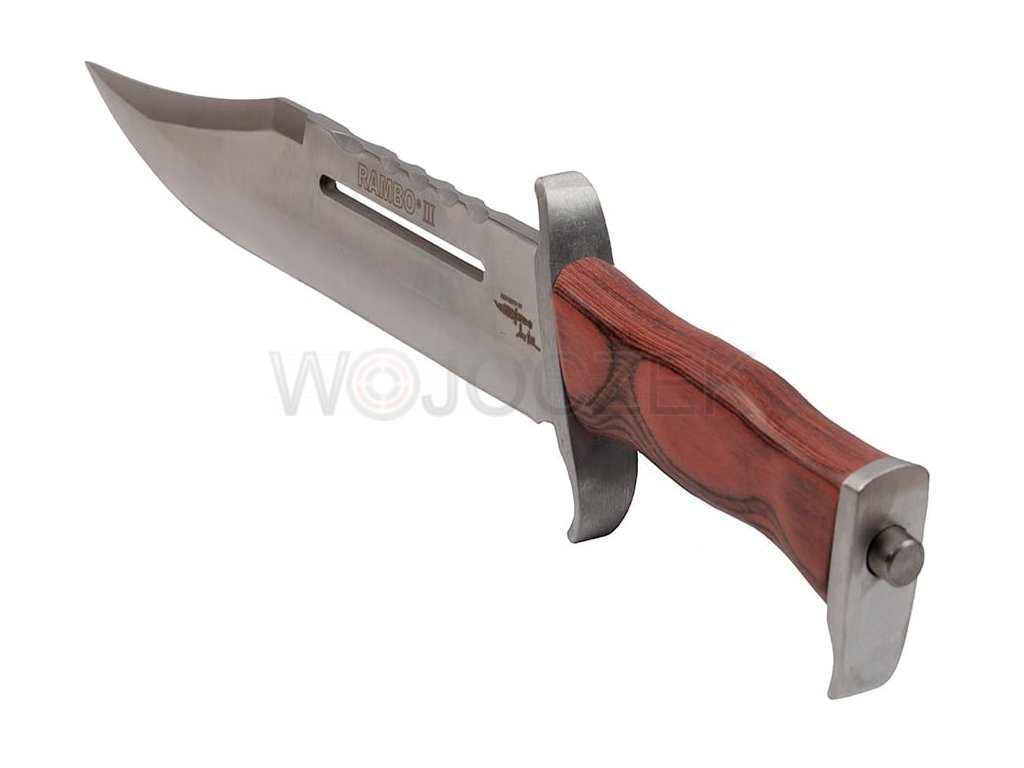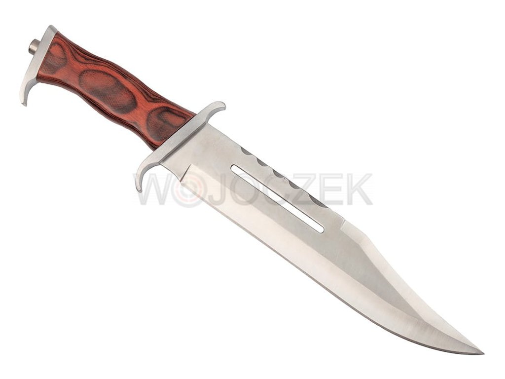 The back is as thick as 5.5 mm! Such a construction makes the knife extremely solid and gains universal use. The comfortable handle is made of lacquered wood. It is ergonomically profiled to lie best in the hand. The metal head has a massive protuberance, which can be used to break glass, hammer nails or stun an opponent. The Rambo knife is equipped with a wide metal hilt, which effectively protects the hand from slipping on the cutting edge. It also allows the hand and thumb to rest comfortably. It comes with a leather pouch that can be attached to a trouser belt. This large knife is designed to meet the needs of any professional user.