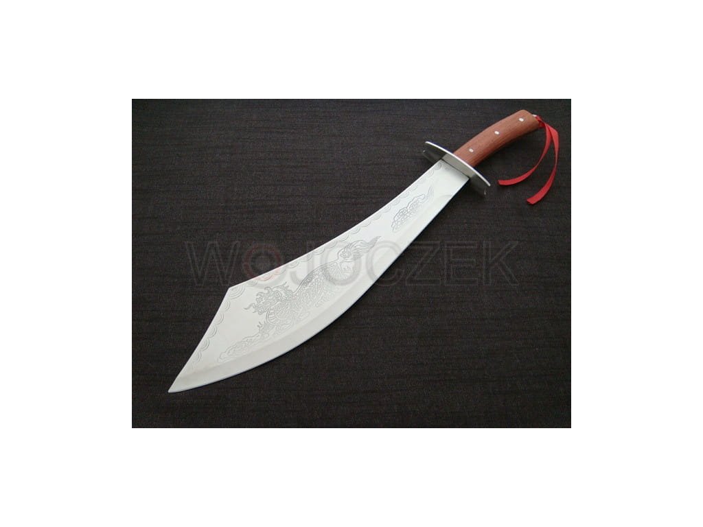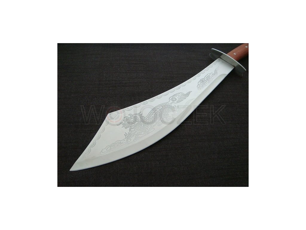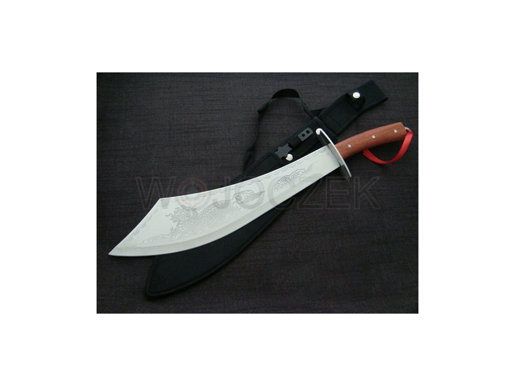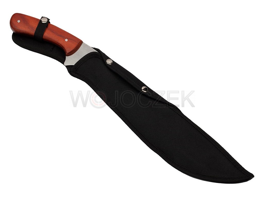 TECHNICAL DATA: Total length: 52 cm Blade length: 36 cm Blade width: 4.5 cm to 9.5 cm Blade thickness: 3 mm Weight in the case: 715 g Steel: 420 Handle: metal + wood Sheath: cordura Included there is a dart 15.5 cm long. Country of origin: PRC