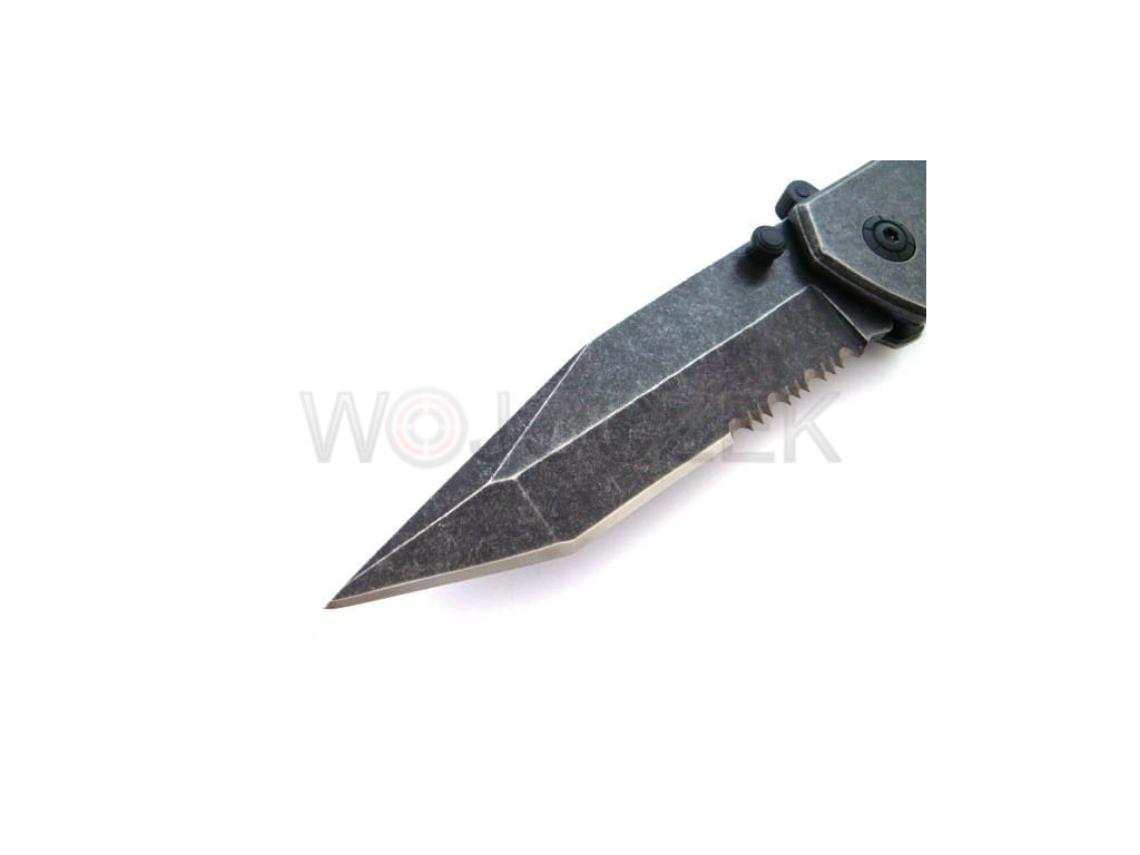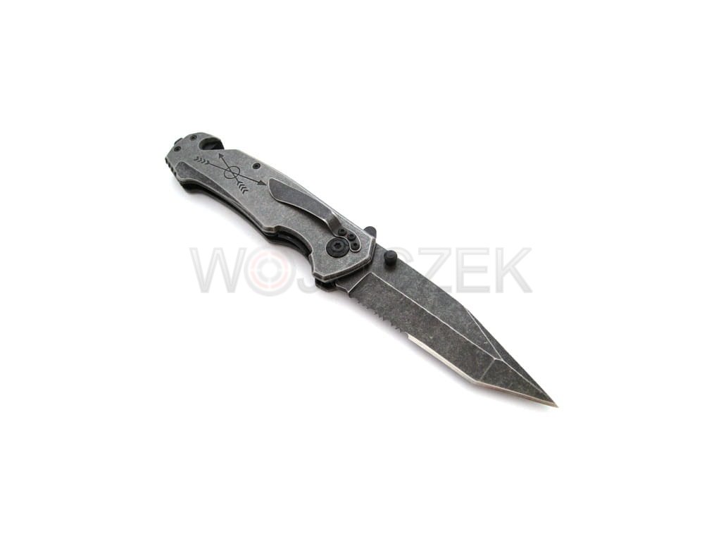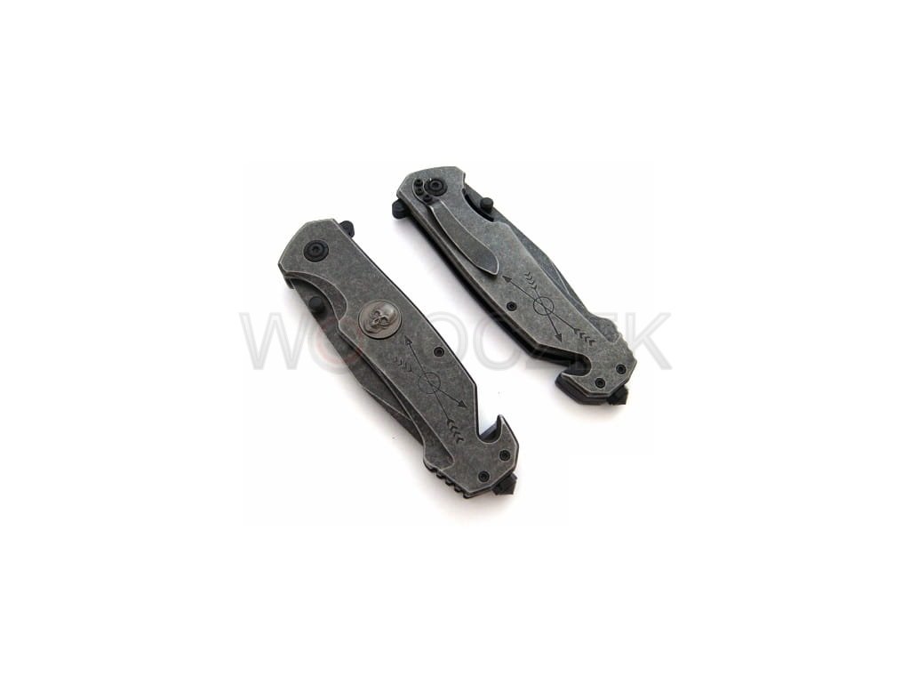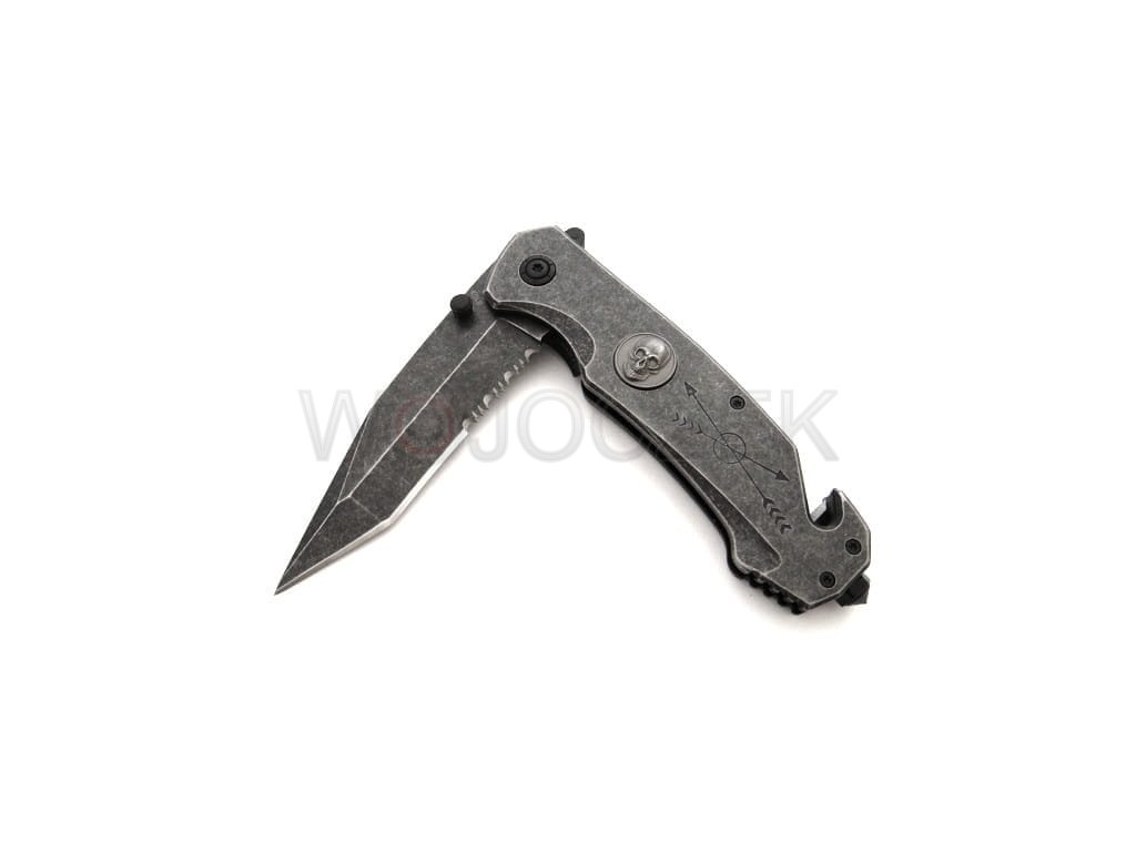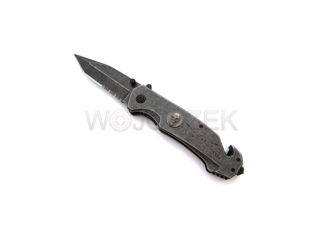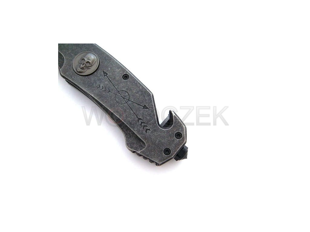 N-363C SPRING RESCUE KNIFE A powerful and reliable rescue knife that will be an excellent tool in emergency situations. It is relatively heavy to fit securely in your hand during use. It features additional decorations such as skull appliqués and engraved arrows. The spring knife has a blade with a modified tanto profile made of high-quality 440 stainless steel. This material is exceptionally resistant to damage and exhibits high anti-corrosion properties. Additionally, the stonewash coating looks stunning and effectively eliminates glare. The rescue knife's blade consists of a broken, smooth edge and serrations, which are excellent for tearing and cutting material. The contoured handle is made of heavy metal facings. The knife is ergonomically designed for the hand and allows for prolonged work in the harshest conditions without feeling strained. It's equipped with essential emergency tools like a glass breaker and a safety blade for cutting belts and ropes. Knives of this type should always be within easy reach, and the N-363C model features a metal clip that can be attached to a belt or pocket. The knife opens quickly and intuitively using a spring-assisted slider. It can also be opened using the double-sided thumb stud, making it easier for left-handed users. The liner lock effectively secures the blade against accidental closing. It's an excellent and reliable tool for any occasion, even the most dire.