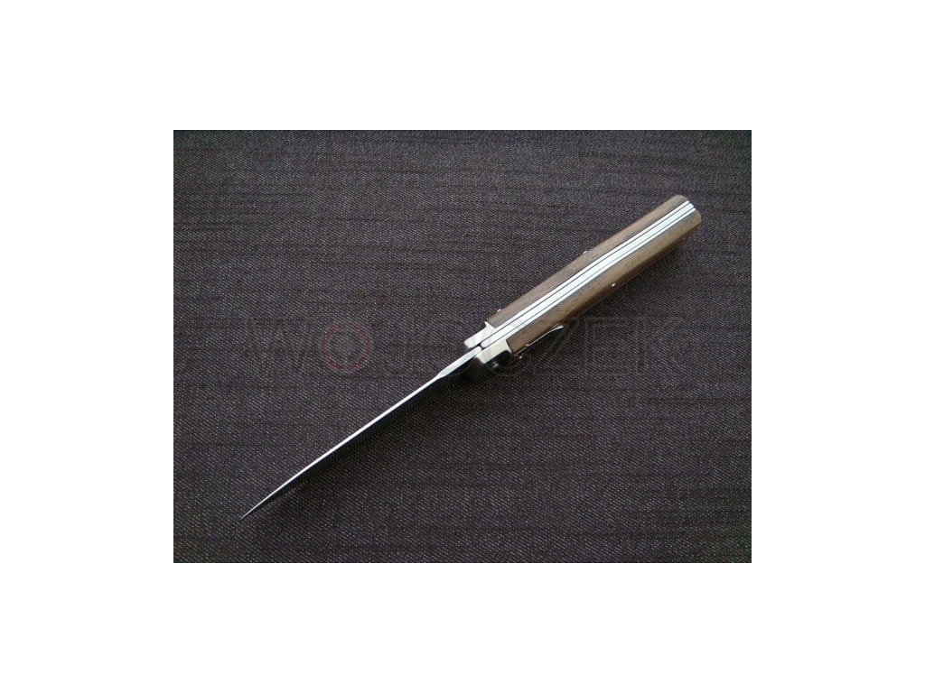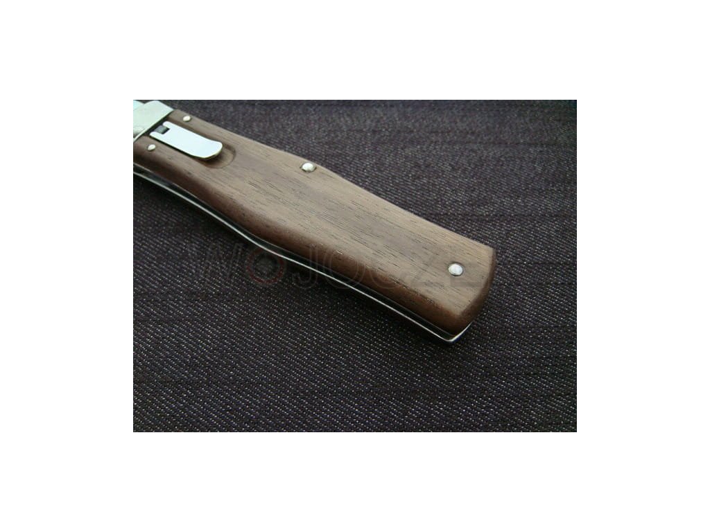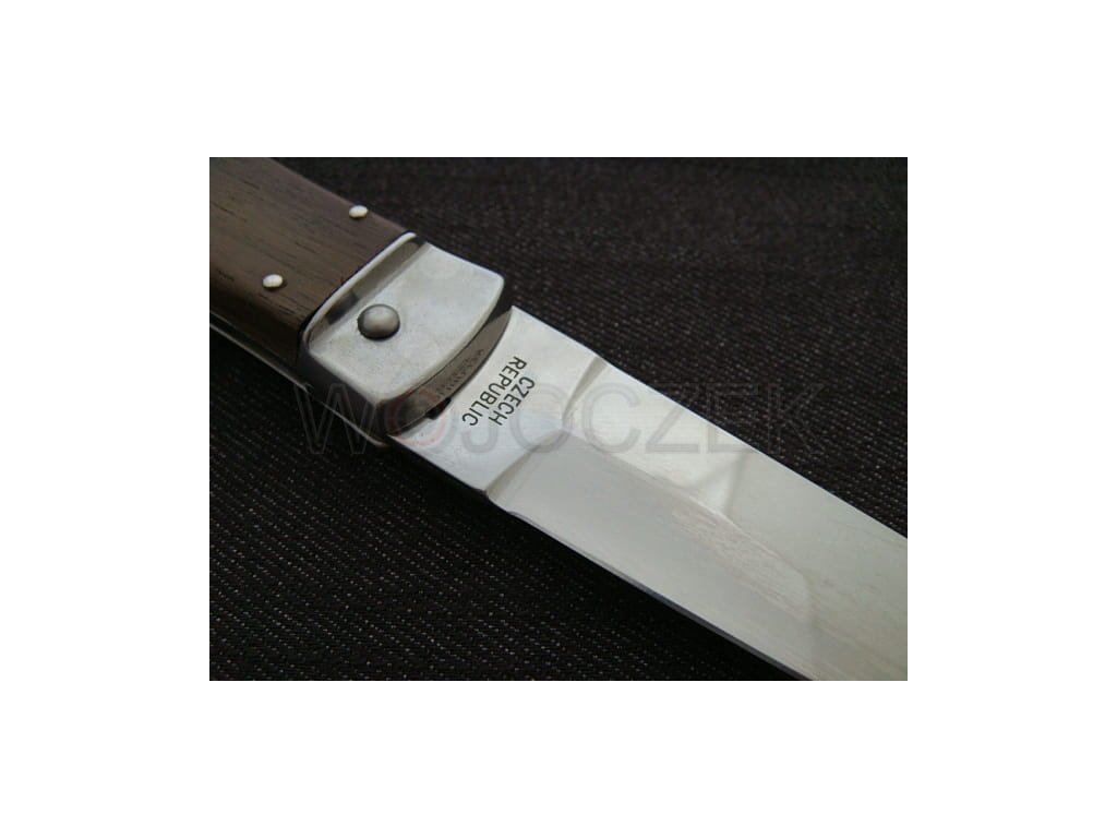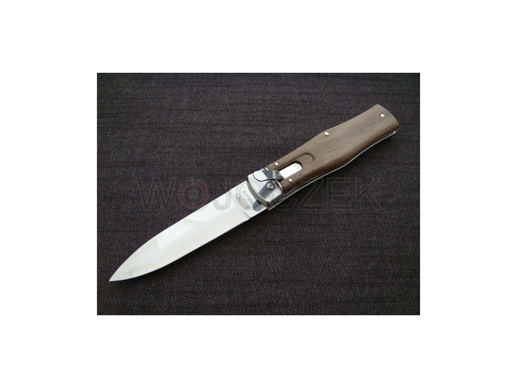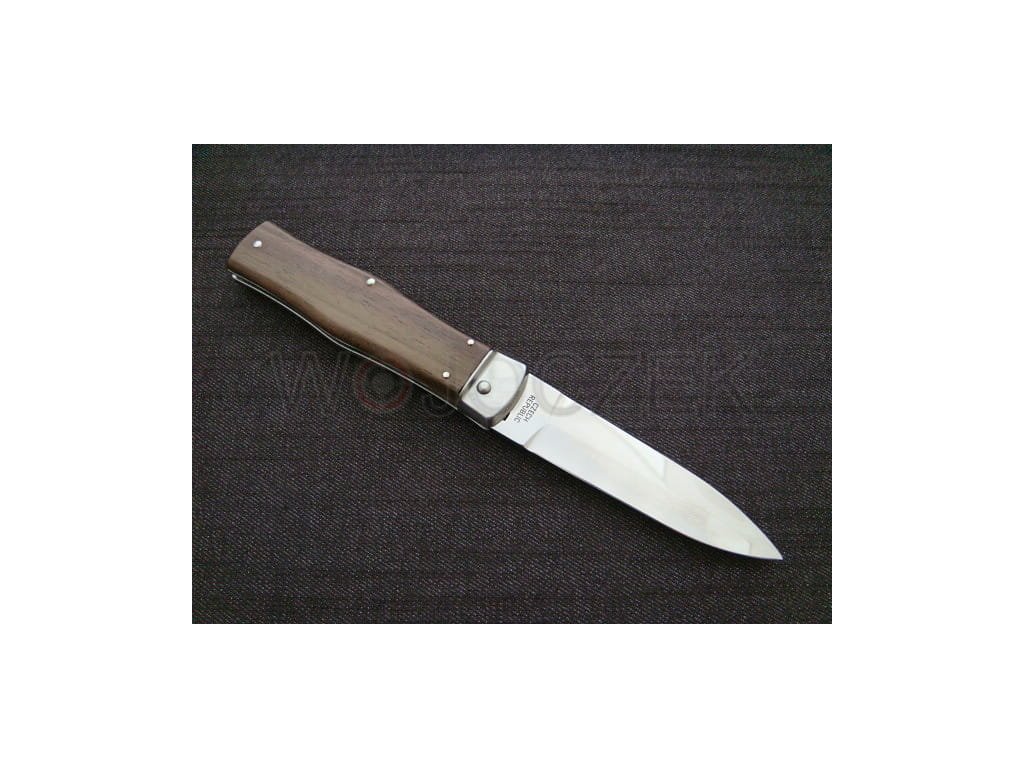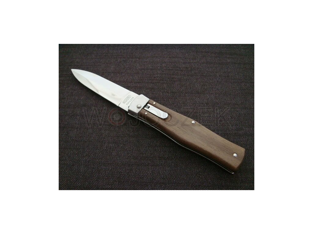 SPRING KNIFE MIKOV PREDATOR 241-ND-1/KP. A knife from the renowned Czech company MIKOV, which has been producing top-class knives for over 200 years. The Predator series of knives are very solid pocket knives that are perfect as everyday knives. The 241-ND-1 model has a spearpoint blade made of AISI420 stainless steel and a wooden handle. A button on the handle is used to open and close the knife, which also serves as a lock. The set includes a leather cover with a belt attachment. The knife is packed in the original box. TECHNICAL DATA: Total length: 21.5 cm Blade length: 9.5 cm Blade width: 2.3 cm Folded length: 12 cm Weight: 147 g Steel: AISI 420 with a hardness of 54HRc Handle: wood Lock: yes Cover: leather Manufacturer: MIKOV Country of origin: Czech Republic