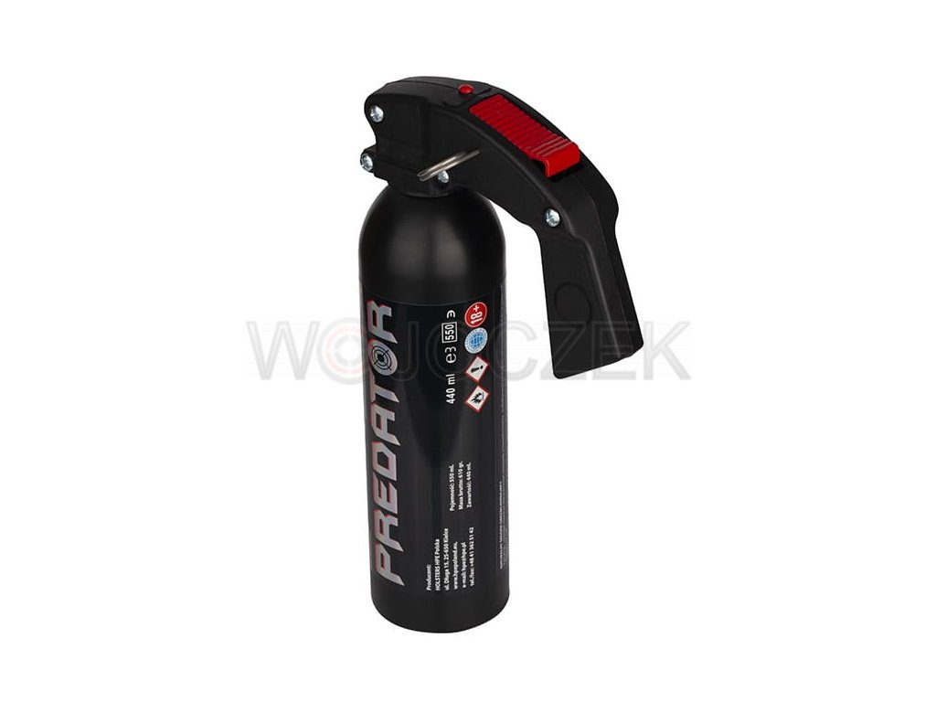 PEPPER GAS PREDATOR 550 ML - MIST CONE G-034 Fire extinguisher with a volume of 550 ml and the strongest concentration available on the Polish market: 2.0% capsaicin and OC content 15%. Thanks to the quality head and the special selection of the mixture, this is the highest quality pitcher with an effective range of up to 10 m. The container in the form of a fire extinguisher was created to defend against a large group of attackers. . The gas will allow you to instantly incapacitate attackers for about 40 minutes. It neutralizes attackers under the influence of alcohol or drugs just as effectively. Pepper gas irritates the mucous membranes, causes acute burning of the eyes, but also severe suffocation, prevents the attacker from making another attack and significantly hinders his movement. The container has protection against accidental use of gas in an unintended direction and an additional locking pin. Pepper spray used for its intended purpose does not cause harm to health or other adverse effects. The product is recommended especially for uniformed services, guards, security workers, sellers, employees of gas stations, restaurants and bars. NO PERMIT IS REQUIRED TO OWN GAS.