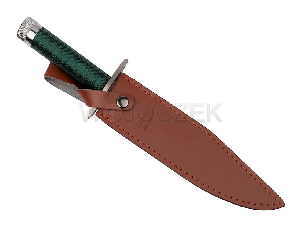The metal handle has been wrapped with a green cord, such a solution allows for a secure and firm grip. The handle holds well in the hand even during bad weather conditions. The handle is also a storage compartment, where we can find a survival kit. The Rambo military knife has a wide metal hilt, which effectively protects the hand from slipping towards the blade. In addition, there are screwdrivers (flat and Phillips) on its ends. The set comes with an eco-leather holster, which can be attached to the belt of the pants. The Rambo tactical knife is a functional tool that will come in handy in any situation.