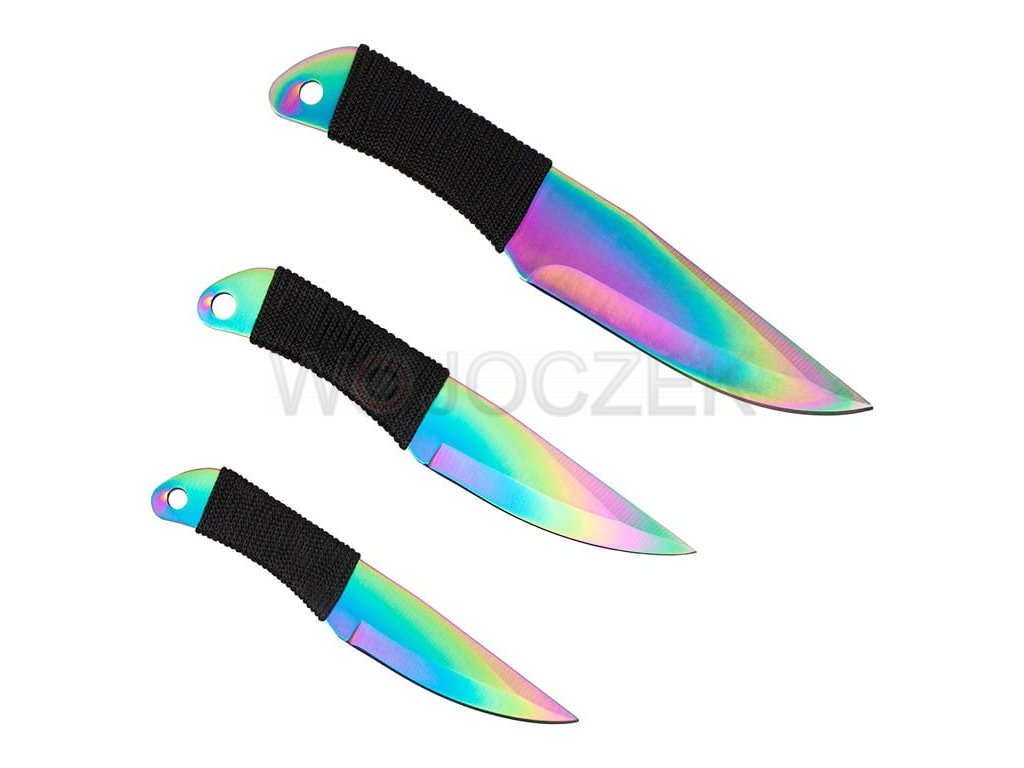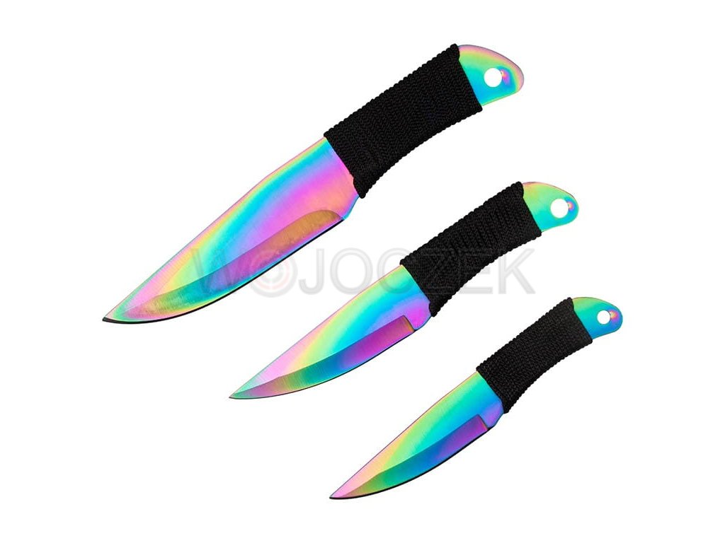 Solidly made and sensational looking set of throwing knives. Oxidized to a special multi-color (Rainbow Fade) they look spectacular. They have Full Tang construction, which guarantees maximum strength and resistance. The monoliths are made of high-quality 420 stainless steel, and each head has a trailing point profile with a smooth blade. The handles have been made of braided material, which provides excellent grip to the hand. The knives are superbly balanced and thus have excellent aerodynamic properties. Training with them is a fantastic exercise in eye-hand coordination, distance estimation, accuracy and throwing technique. The set includes a black cordura pouch that can be attached to the belt of the pants.