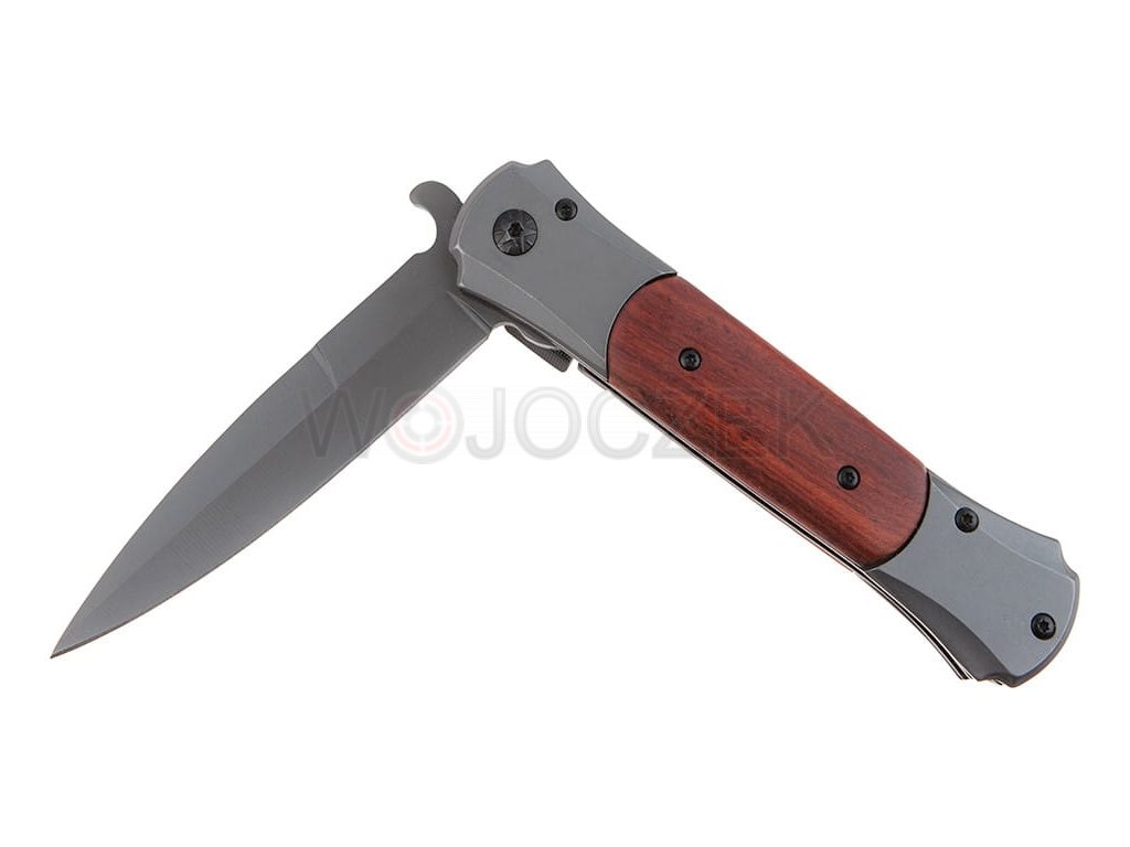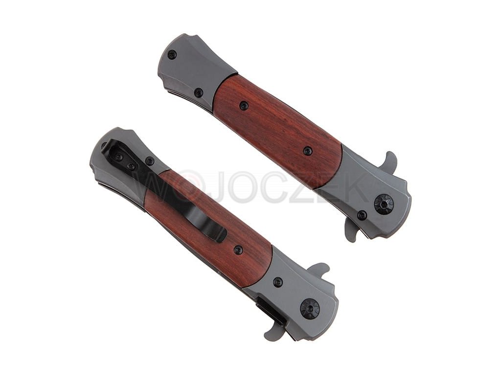 SPRING KNIFE N-522C Neat and solidly made spring knife. It is an ideal tool for everyday EDC (Every Day Carry) work, which can be used at any time. For ease, it has been equipped with a metal clip that allows you to attach the knife to the belt of your pants so that it is always at hand. The blade with a spear point profile is made of high-quality 420 type stainless steel. The material is additionally covered with a gray, matte coating, which increases anti-corrosion properties and is resistant to scratches. The ergonomic handle is made of metal covered with wooden cladding. The knife is semi-automatic, which means that with a little force it will open on its own in a flash. The assisted flipper is used for opening, which is extremely convenient and easy to use. The spring knife has a classic liner lock that prevents the knife from being closed unintentionally. A great tool for everyday needs.