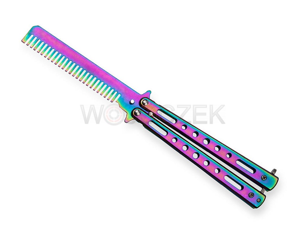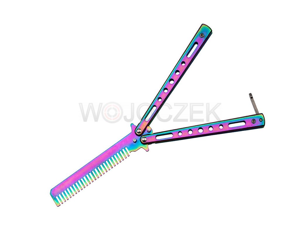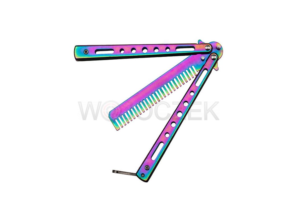 Butterfly knife with a comb instead of a blade. Ideal for practicing your skills and grooming your hair. No sharp tips or edges. Practice tricks with the butterfly knife and always have a perfectly styled hairstyle. The knife has a blunt blade, so no trick will be dangerous. Made of high quality stainless steel, practice as much as you want without worrying about damaging the object. Now you will be able to practice anywhere and anytime without the risk of hurting someone. The effect when performing tricks is definitely greater thanks to the custom cutouts. The butterfly comb will be an original gift idea for any knife collector, owner of a lush hair and owner of a lush beard.