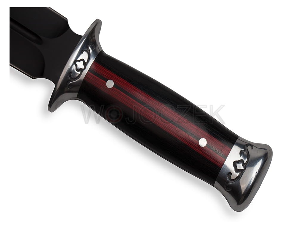 Pohodlná masivní rukojeť je vyrobena z kovu a černého a červeného dřeva.