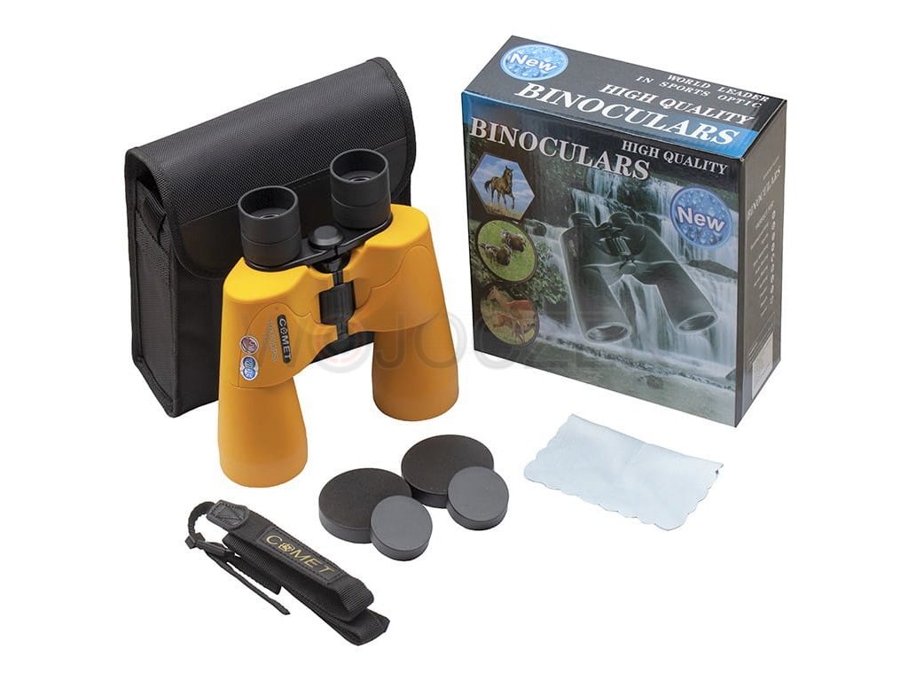 Zestaw zawiera: lornetkę COMET 10x50, dekielki - 4 sztuki, futerał z paskiem, ściereczkę do czyszczenia, pasek do zawieszenia lornetki oraz kartonowe pudełko.