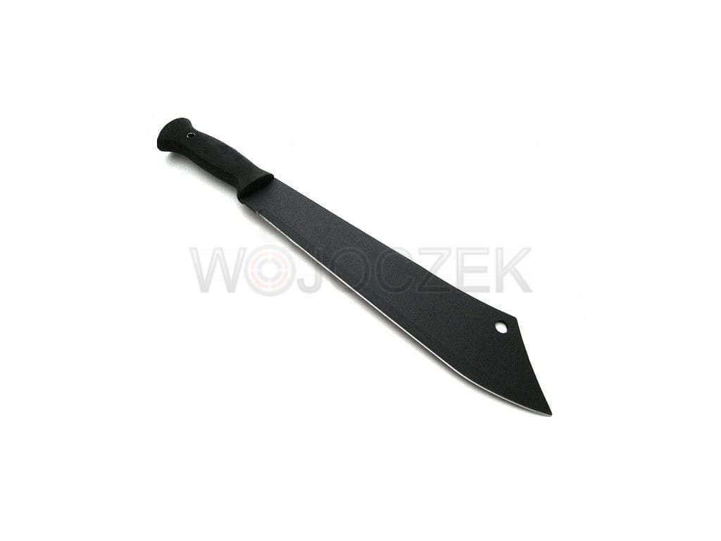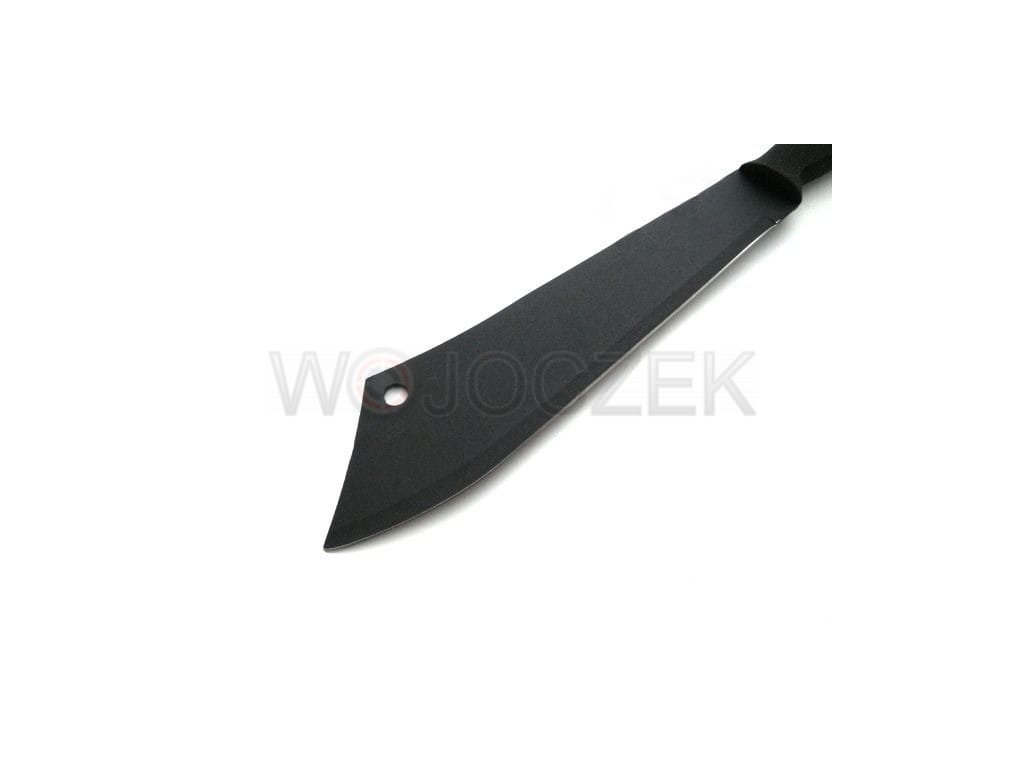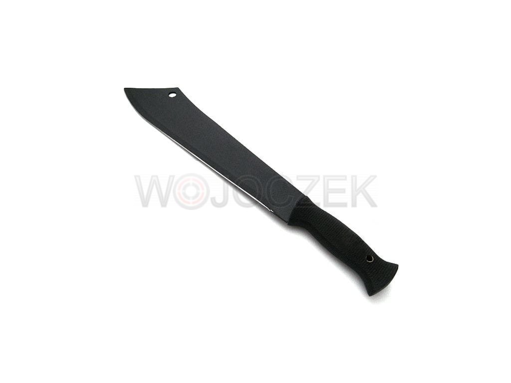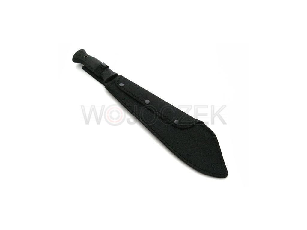 MACZETA 45 CM N-607 Potężna, niezwykle solidna maczeta przypominająca swym wyglądem wielki tasak. Będzie ona idealnym narzędziem podczas survivalu i outdooru do karczowania, rąbania, ścinania, batonowania a nawet podkopywania czy oprawiania. Mocarna głownia o profilu zbliżonym do nessmuk została wykonana z wysokojakościowej stali nierdzewnej typu 420, pokrytej czarną powłoką ochronną. Matowa powierzchnia nadaje głowni odporności na uszkodzenia i korozję oraz niweluje efekt odblasku. Na grzbiecie znajduje się otwór do zawieszenia noża o hak czy gałąź. Antypoślizgowa, ergonomiczna rękojeść jest wykonana z gumopodobnego tworzywa o chropowatej fakturze. Maczeta idealnie leży w dłoni, pozwalając na mocny i pewny chwyt nawet podczas najgorszych warunków pogodowych. Jest stosunkowo ciężka, a środek ciężkości jest przeniesiony na głownie, co ułatwia wykonanie zamachu przy wykonywaniu prac. W tylnej części znajduje się otwór do zawiązania sznurka bądź linki. Maczeta posiada czarną, klasyczną kaburę z cordury, którą można przymocować do paska spodni.