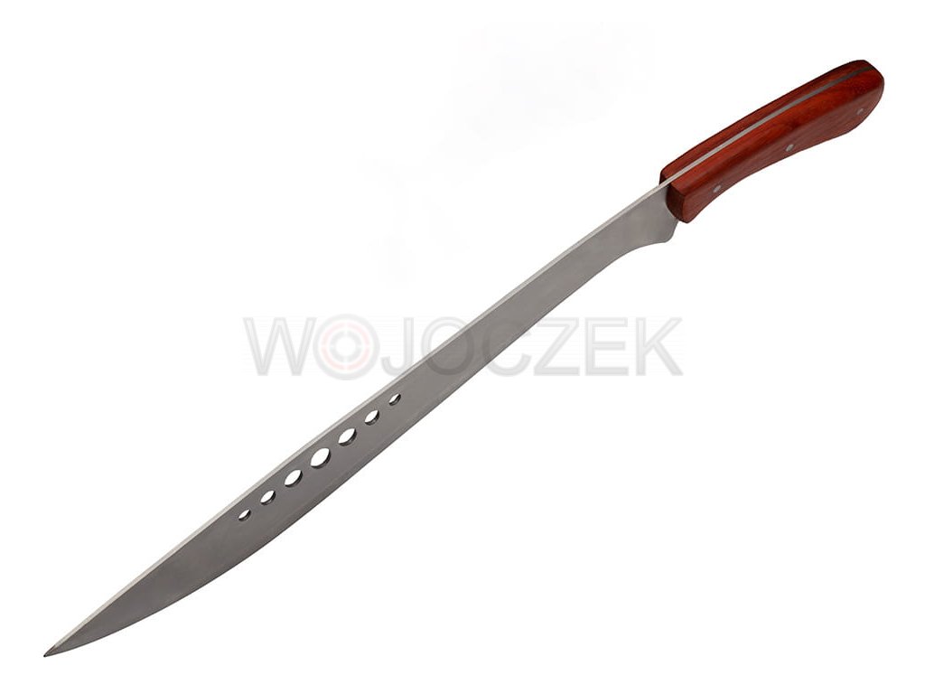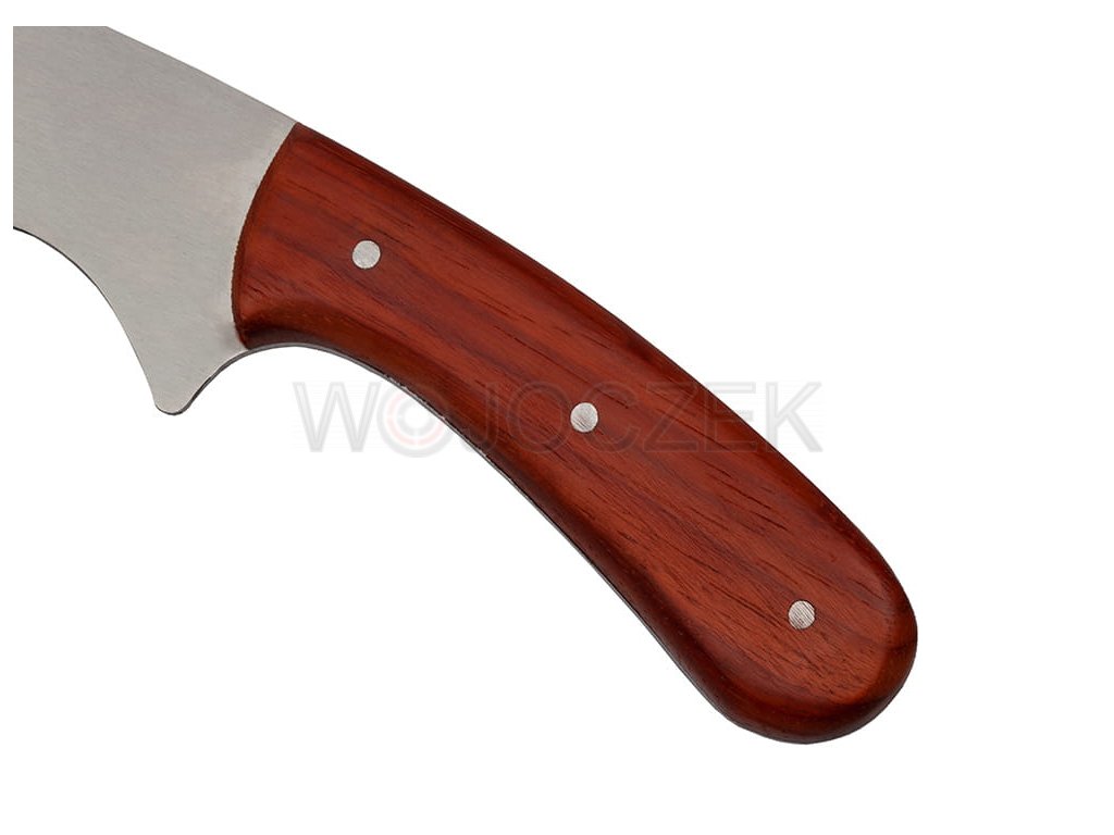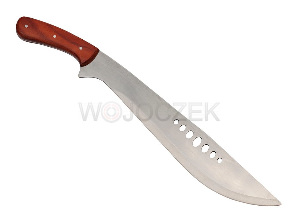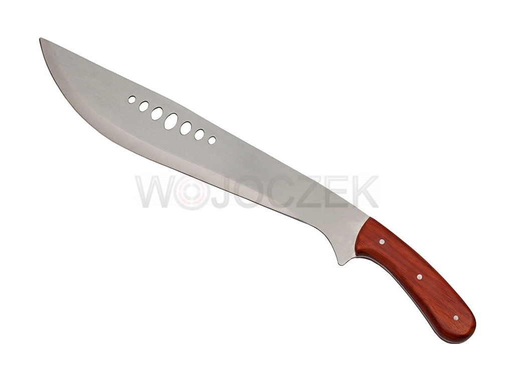 Dane techniczne: Typ noża: maczeta kukri Profil głowni: drop point Typ ostrza: gładkie Długość całkowita: 510 mm Długość ostrza: 375 mm Długość rękojeści: 135 mm Szerokość głowni: 63 mm Grubość głowni: 2,3 mm Waga: 410 g Materiał głowni: stal nierdzewna 420 Materiał rękojeści: stal + drewno Pokrowiec: tak, cordura Budowa typu Full Tang Producent: BSH Kraj pochodzenia: PRC