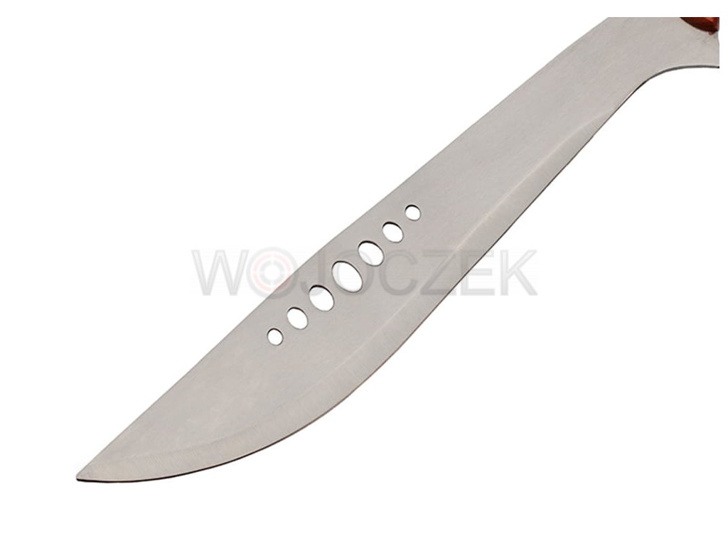MACZETA KUKRI 51 CM N-603 Ogromna i bardzo solidna maczeta inspirowana oryginalnym krojem noża myśliwskiego rdzennych ludów nepalskich. Maczeta Kukri posiada niezawodną i bardzo wytrzymałą konstrukcję typu Full Tang, wykonaną z wysokogatunkowej stali nierdzewnej typu 420. Monolit przechodzi przez całą długość maczety nadając jej niesamowitą trwałość i odporność na ewentualne uszkodzenia. Ergonomiczna, drewniana rękojeść została przymocowana do trzonka za pomocą nitów. Maczeta Kukri dobrze leży w dłoni, a przeniesienie środka ciężkości na głownie ułatwia cięcie i rąbanie. Jest to idealne narzędzie do karczowania oraz wycinania gałęzi, krzewów i traw, a także do podkopywania czy budowy obozu. W zestawie znajduje się klasyczny, czarny pokrowiec z cordury.