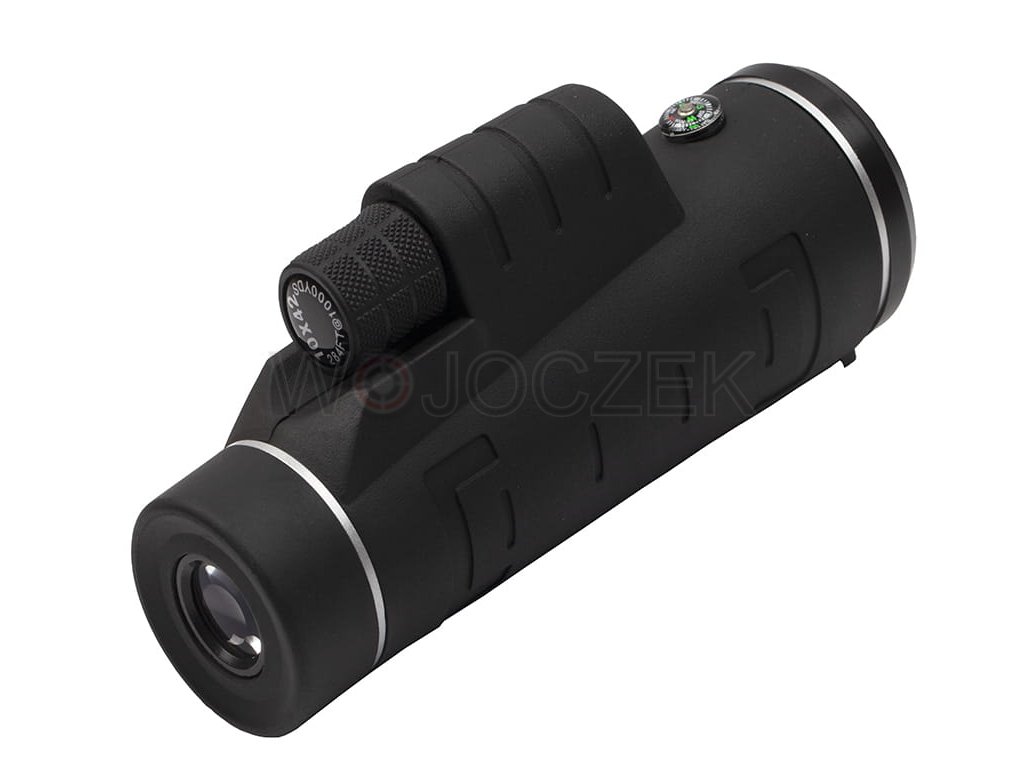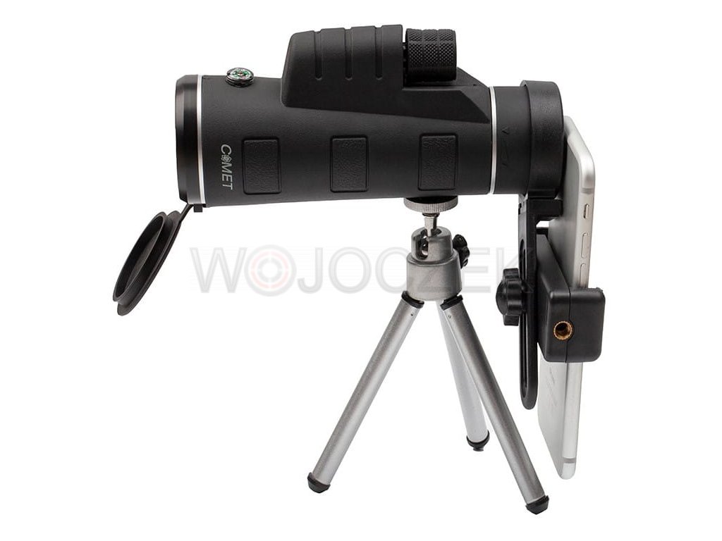 W zestawie: Monokular COMET LR-084, dekielki, ściereczka do czyszczenia, pasek na rękę, futerał, statyw oraz adapter do telefonu.