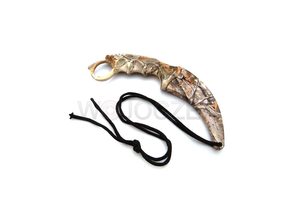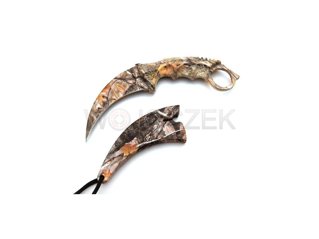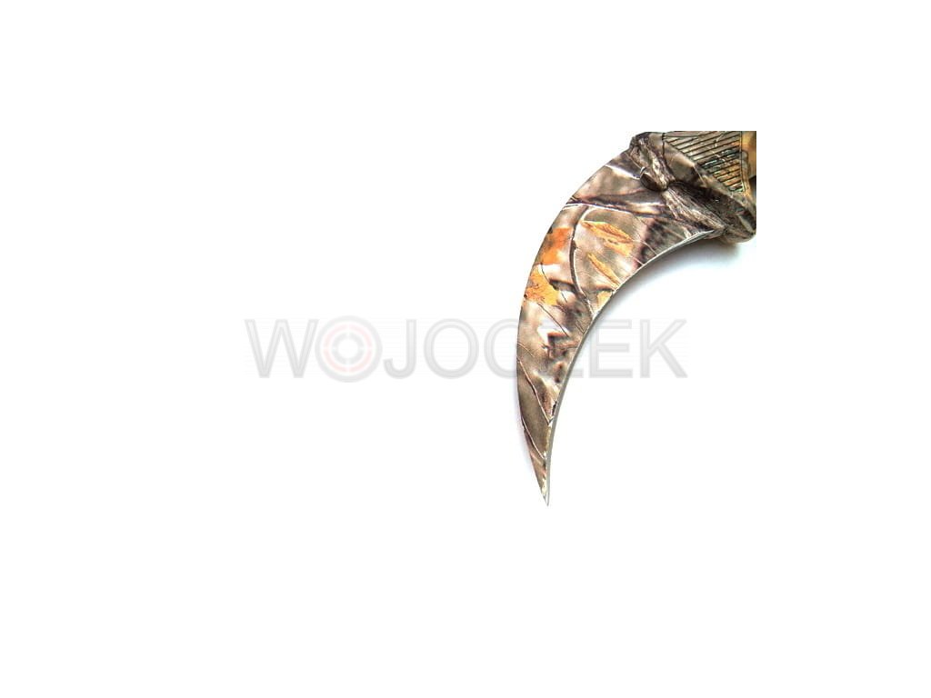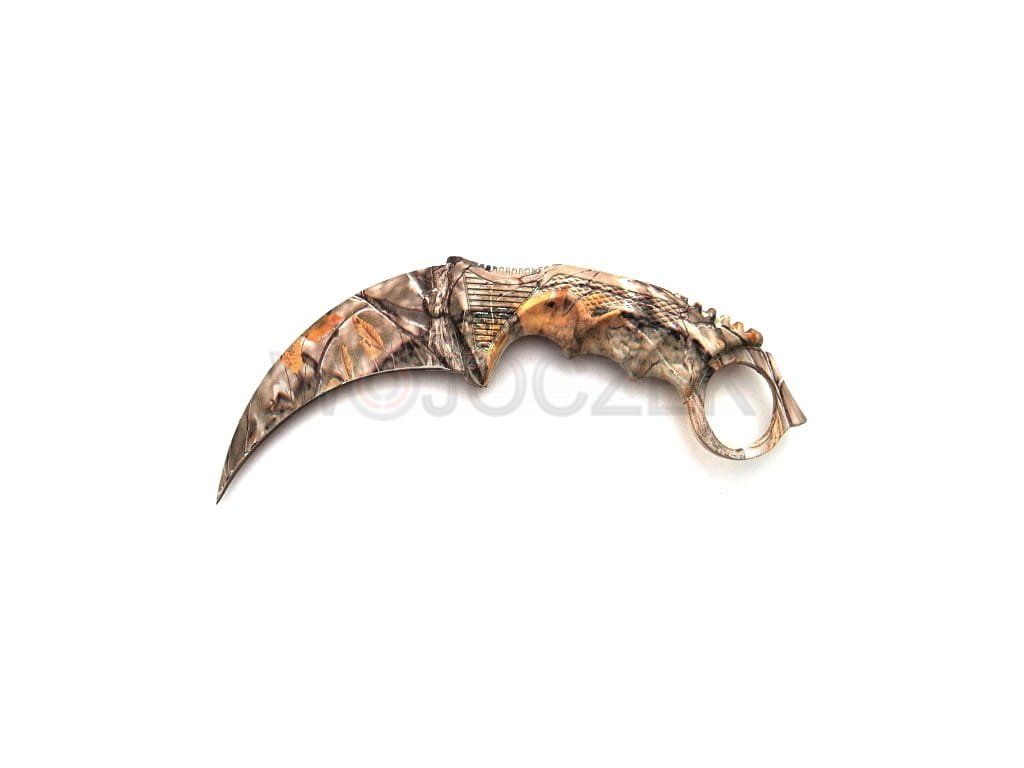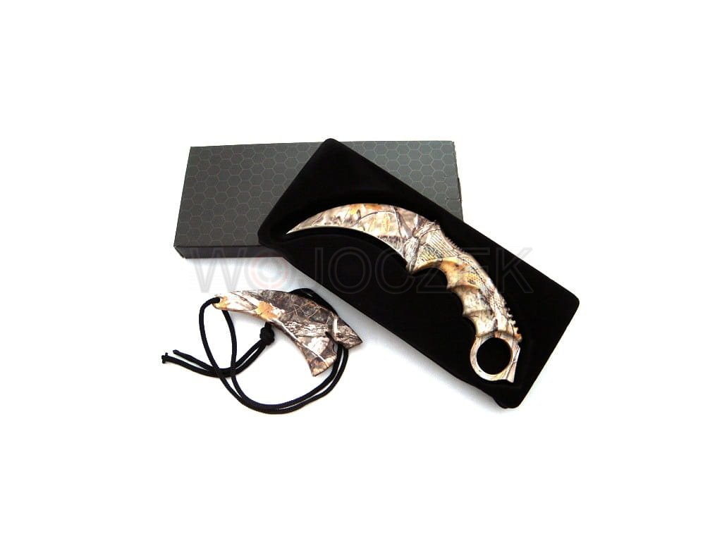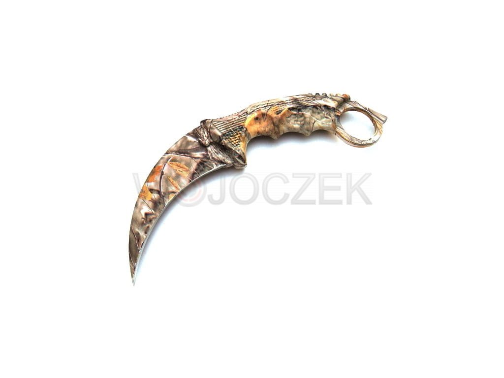 Designerski karambit pokryty w całości fantastycznym nadrukiem myśliwskim w stylu leśnego kamuflażu. Noże tego typu tradycyjnie wywodzą się z Indonezji, gdzie były używana przez rdzenną ludność jako broń. Współczesne modele zostały rozpowszechnione za sprawą kultowej gry komputerowej Counter Strike CS:GO, w której używane są jako jedna z broni do wyboru gracza.