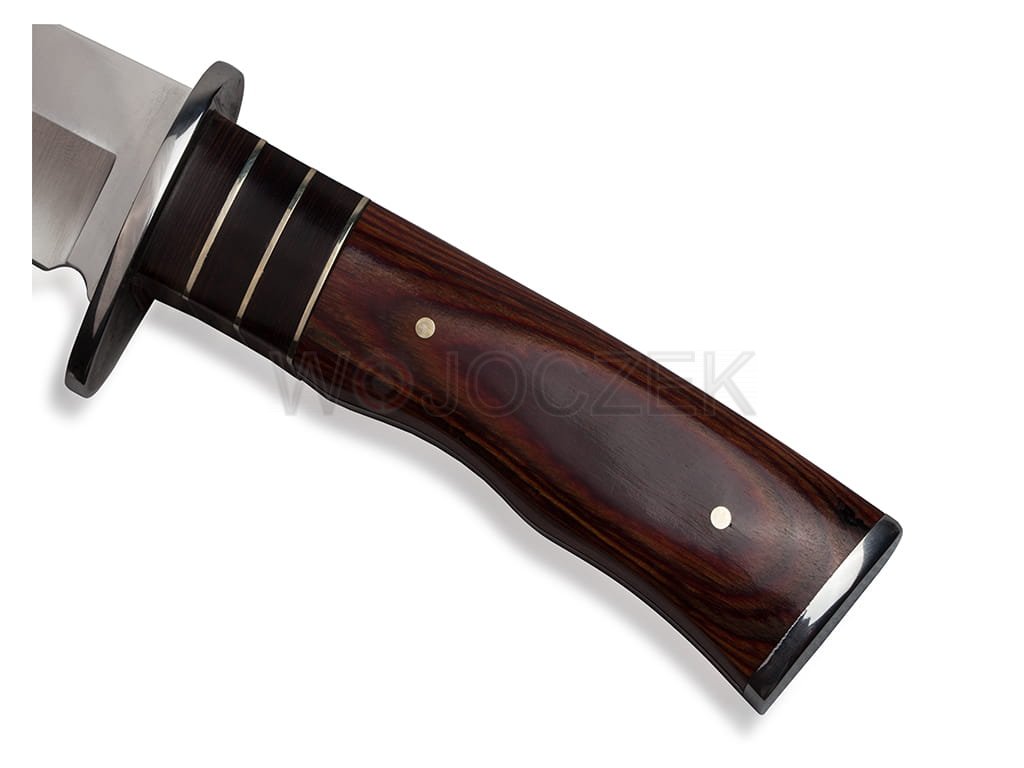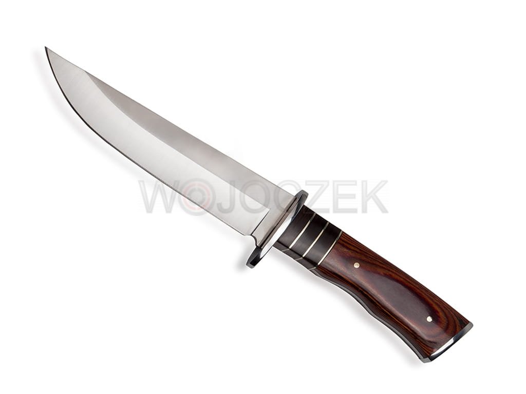 Głownia o tradycyjnym profilu straight back została wykonana z wysokojakościowej stali nierdzewnej numer 420. Materiał ten jest odporny na ścieranie i tępienie, a równocześnie bardzo łatwy i podatny przy ostrzeniu. Nóż myśliwski posiada konstrukcję typu Hidden Tang, która maksymalizuje jego wytrzymałość na ewentualne uszkodzenia. Ergonomicznie profilowana rękojeść świetnie leży w dłoni i pozwala na komfortową pracę nawet przez długi czas. Została ona wykonana z metalu obłożonego stylowymi okładzinami z drewna. Nóż turystyczny posiada stalowy jelec, który skutecznie chroni dłoń przed zsunięciem się w stronę krawędzi tnącej. W zestawie znajduje się czarny pokrowiec z cordury, który można przymocować do paska spodni. Ten niezwykle ostry nóż myśliwski to niezawodne narzędzie, które posłuży na wiele lat!