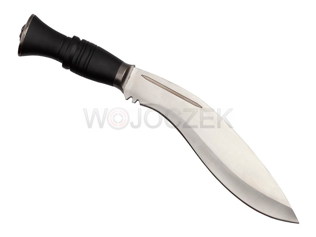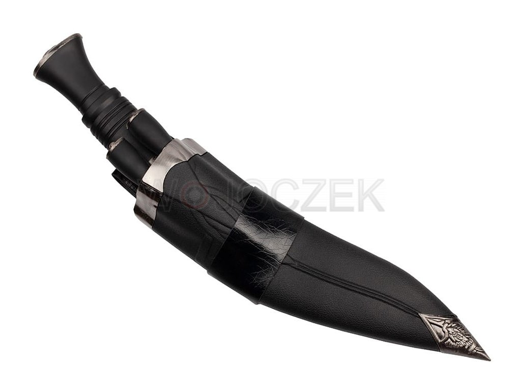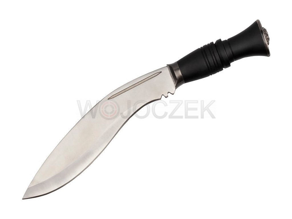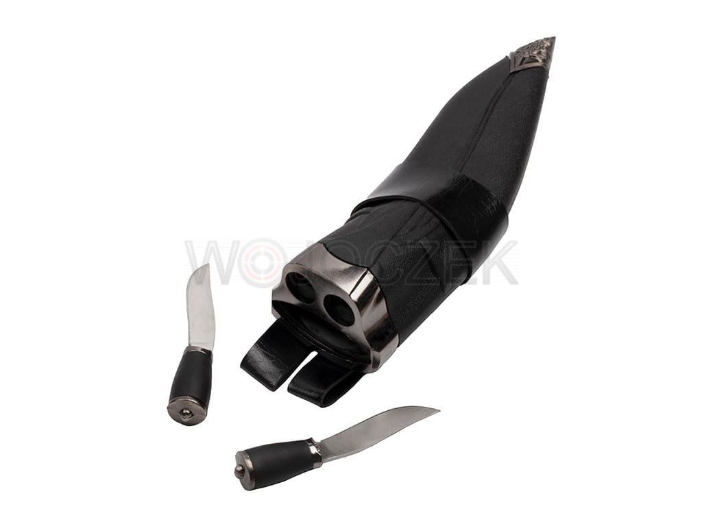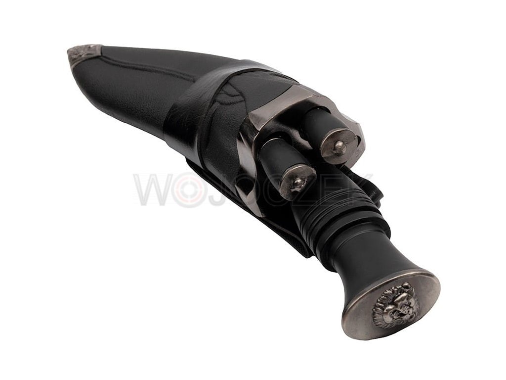 Przepięknie wykonany nóż myśliwski stylizowany na tradycyjnej maczecie kukri, używanej przez rdzenne ludy nepalskie. Niewielkie rozmiary nadrabiane są przez siłę z jaką potrafi ciąć i rąbać. Głownia o klasycznym dla noża kukri zakrzywieniu została wykonana ze stali nierdzewnej typu 420. Gruby kawałek jednolitej stali jest bardzo masywny i odporny na ewentualne uszkodzenia. Wygodna rękojeść została wykonana z wytrzymałego tworzywa ABS. Maczeta kukri świetnie leży w dłoni, a dzięki przeniesieniu środka ciężkości na głownie pracuje się nią wyjątkowo sprawnie. Na głowicy umieszczono ozdobny grawer przedstawiający wizerunek ryczącego lwa. Nóż kurki posiada sztywną kaburę wykonaną z tworzywa imitującego skórę oraz zdobionego metalu. Pokrowiec jest stylizowany na klasyczną pochwę, którą Gurkhowie nosili przy pasie. Znajduje się w niej miejsce na dwa nożyki (dołączone do zestawu) karda i chakmak. Karda jest narzędziem pomocnym przy oprawianiu zwierzyny, natomiast chakmak to nożyk do rozpalania ognia przy pomocy krzemienia. Ten przepięknie wykonany, elegancki zestaw łączy w sobie tradycyjny design z nowoczesnym wykonaniem.