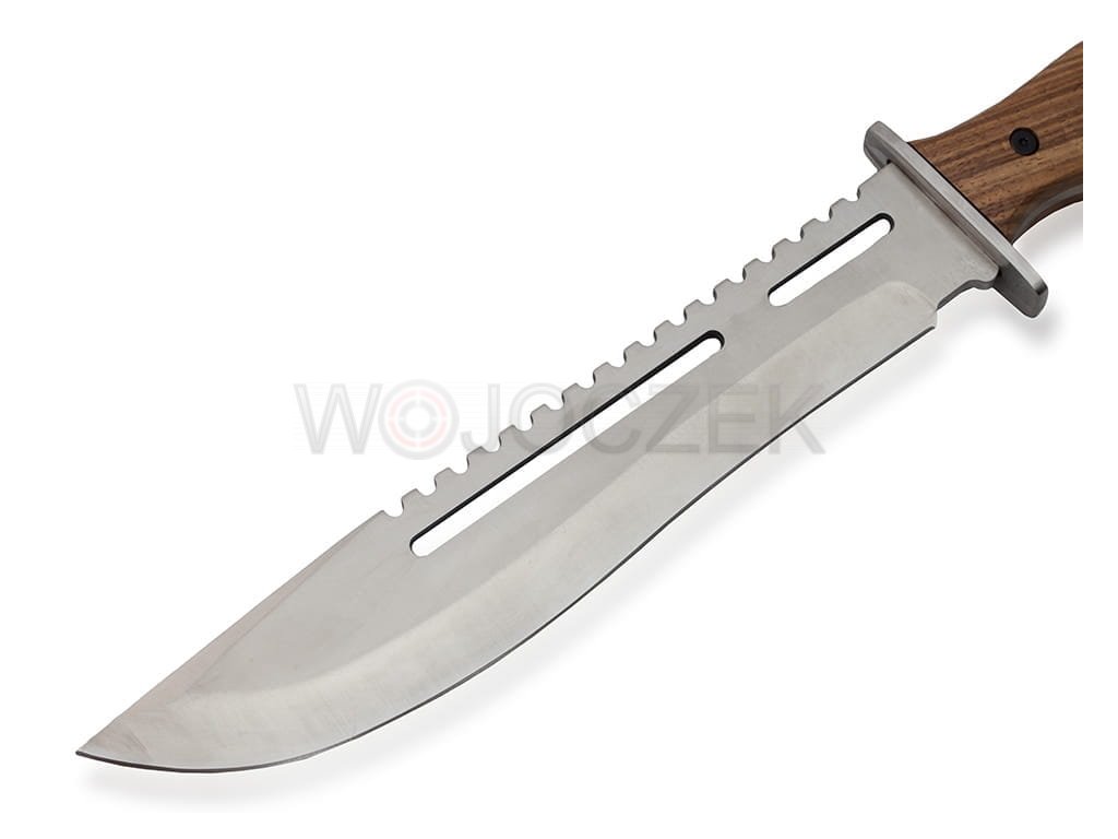 NÓŻ MYŚLIWSKI - MACZETA 40 CM N-631B Wielki, potężny i niezwykle solidny nóż myśliwski - maczeta. Jego nadzwyczaj niezawodna konstrukcja typu Full Tang, gwarantuje ogromną wytrzymałość i odporność na ewentualne uszkodzenia. Masywny monolit, który przechodzi przez całą długość noża, został wykonany z wysokojakościowej stali nierdzewnej typu 440, która jest łatwa w procesie ostrzenia. Głownia o zmodyfikowanym, rozszerzonym profilu typu clip point jest ostra i świetnie nadaje się nie tylko do cięcia, ale także do rąbania i karczowania. Na grzbiecie nóż myśliwski posiada liczne karbowanie, które jest uniwersalną, funkcjonalną piłą. Bardzo wygodna i poręczna rękojeść została wykonana z naturalnego drewna. Dzięki niej, mimo swojemu ciężarowi, nóż genialnie leży w dłoni, pozwalając na pewny chwyt i mocny zamach. Nóż myśliwski posiada dość szeroki jelec, który skutecznie chroni dłoń przed osunięciem się w stronę krawędzi tnącej. W zestawie znajduje się klasyczna, czarna kabura z cordury, którą można przymocować do paska spodni. Potężny nóż - maczeta to idealne narzędzie do cięcia, rąbania i karczowania, bez problemu poradzi sobie z trawą, gałęziami, drzewkami, krzewami etc.