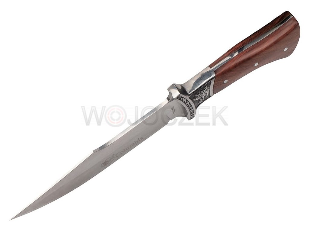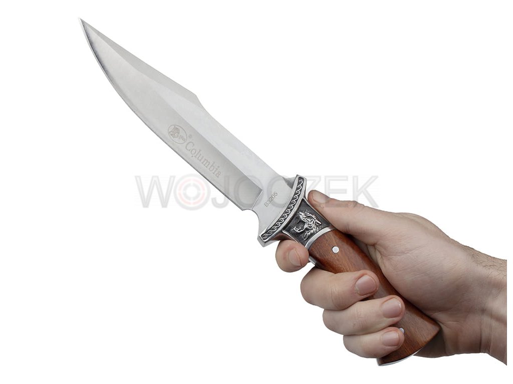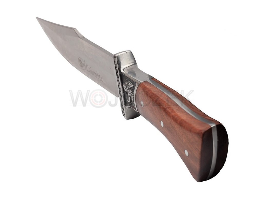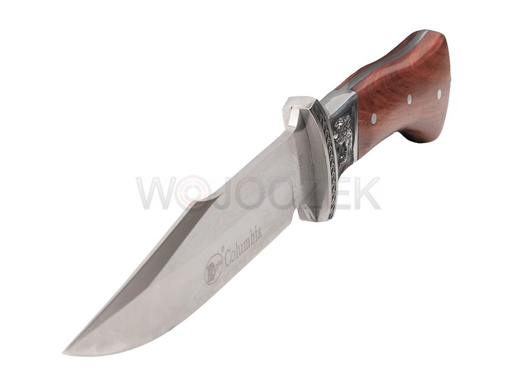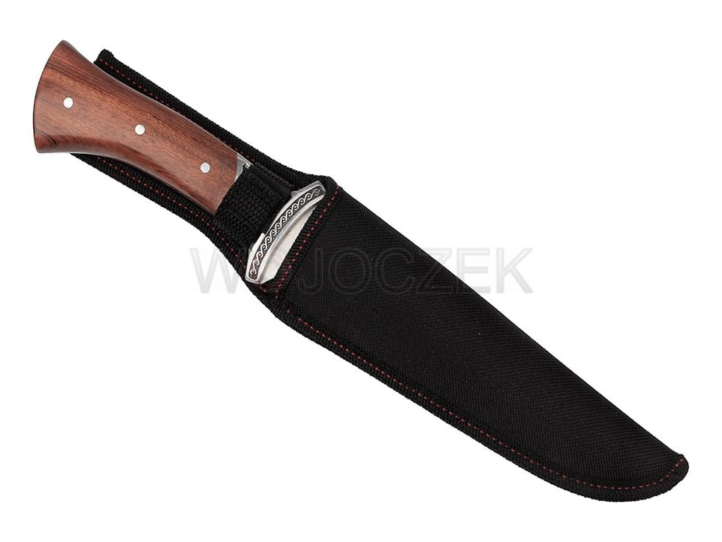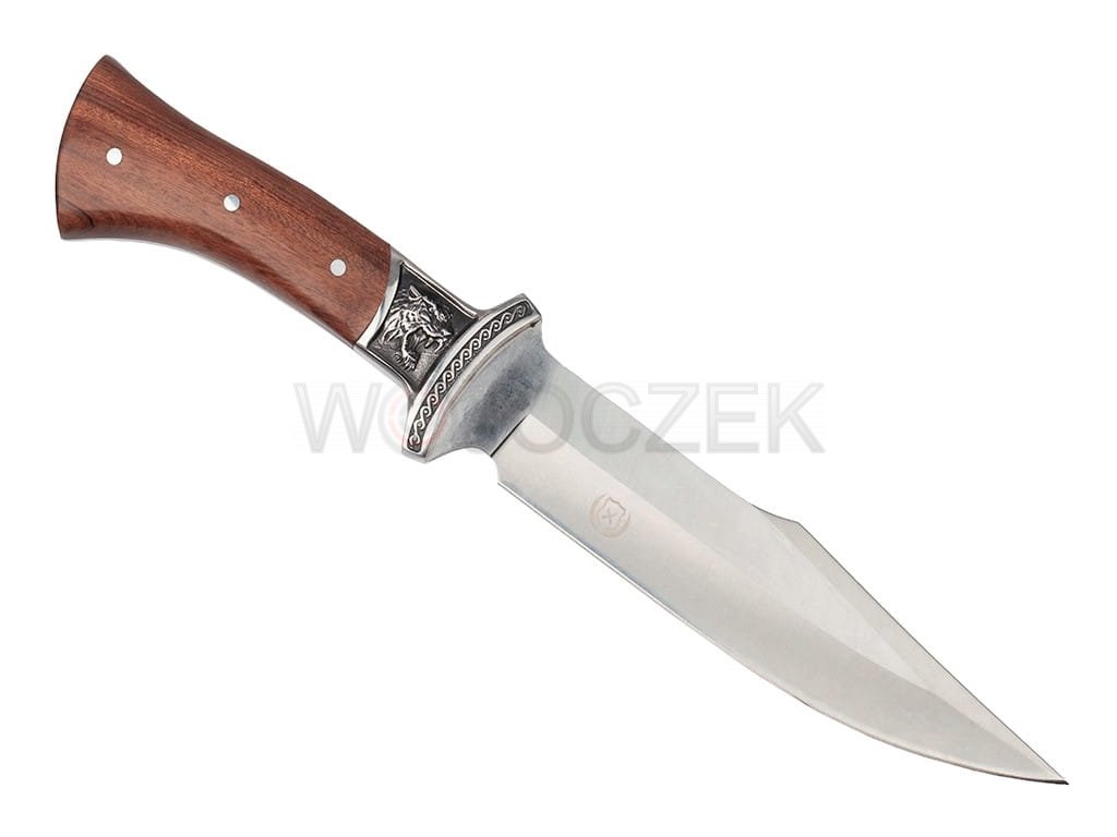 Nóż łowiecki posiada głownię o profilu clip point, która została wykonana z wysokojakościowej stali nierdzewnej typu 420. Materiał ten jest wyjątkowo odporny na uszkodzenia i posiada wysokie właściwości antykorozyjne. Stal ciągnie się przez całą długość noża tworząc niezwykle solidną budowę typu Full Tang. Konstrukcja ta gwarantuje maksymalną wytrzymałość. Rękojeść składa się z drewnianych, profilowanych okładzin. Jest ergonomiczna i świetnie leży w dłoni, zapewniając wyjątkowy komfort podczas wykonywanej pracy. Nóż został wyposażony w ozdobny, metalowy jelec, który świetnie chroni dłoń przed zsunięciem się na ostrze noża. Widnieje na nim dwustronny wizerunek tygrysa. W zestawie dołączona została pochwa z cordury, którą można przymocować do paska spodni.