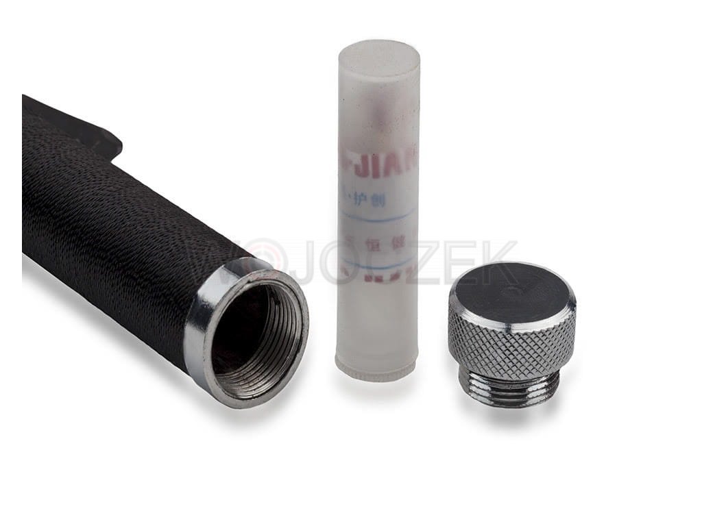 Rękojeść metalowa, opleciona sznurkiem - posiada zakręcany schowek na niezbędne rzeczy.