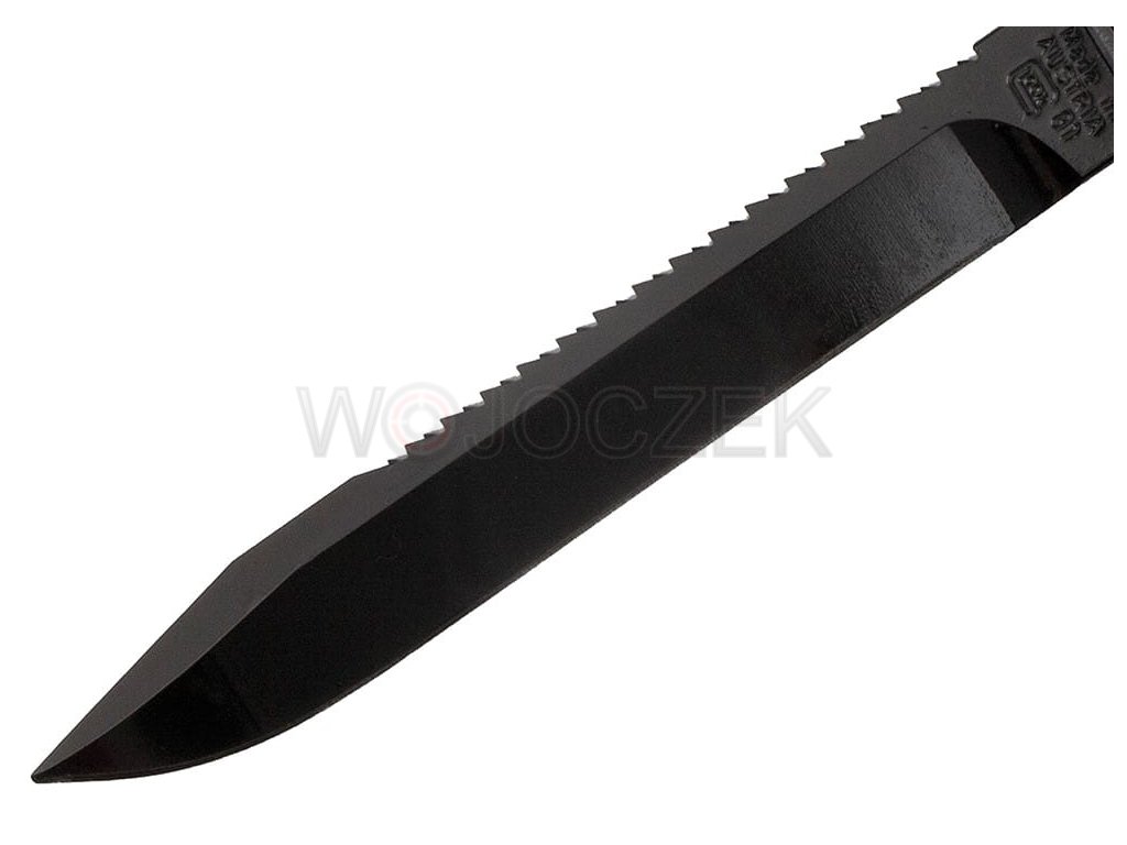 NÓŻ SZTURMOWY GLOCK 81 BLACK. Seria noży Glock została opracowana w 1975 r. przez austriacką firmę Glock. Już rok później w 1976 r. został oficjalnym szturmowym nożem austriackiej armii. Do dziś nieprzerwanie jest na wyposażeniu wielu jednostek na całym świecie (w tym polskiej armii). Obecnie jako legenda jest chętnie kupowany przez żołnierzy jak i osoby cywilne. Glock 81 jest prosty w budowie, dobrze wyważony, a przy tym niezwykle wytrzymały. Głownia wykonana jest z grubej czernionej stali nierdzewnej. Na górnej części ostrza znajduje się bardzo skuteczna dwurzędowa piła, pozwalająca na przecięcie nawet grubej gałęzi. Rękojeść wykonano z twardego polimeru tego samego, którego używa się do produkcji pistoletów Glock. Metalowy jelec chroni rękę przed niekontrolowanym zsunięciem na ostrze. Jedna ze stron jelca służy jako otwieracz do butelek. Pochwa wykonana jest z tego samego polimeru co rękojeść. Posiada mocny klips, który nie pozwoli na wysunięcie noża. Zapięcie do paska jest tak skonstruowane by szybko zapiąć bez przeplatania przez cały pasek. Polecany na wypady survivalowe i dla kolekcjonerów.