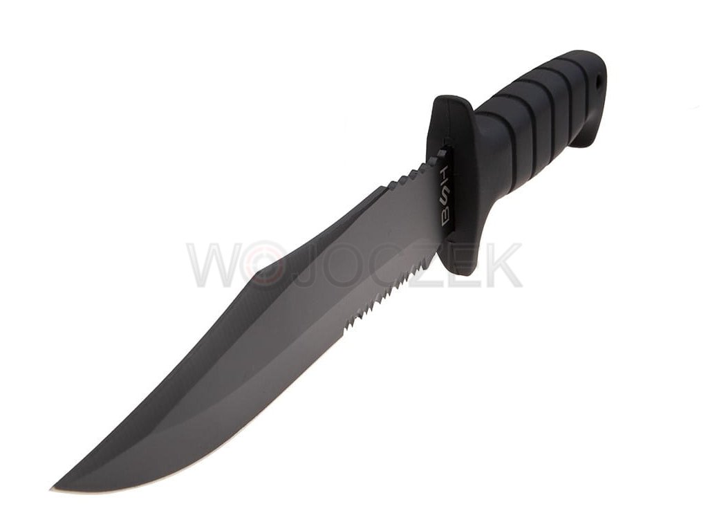 Dane techniczne: Typ noża: z głownią stałą Profil głowni: bowie Typ ostrza: gładkie + częściowo ząbkowane Długość całkowita: 287 mm Długość głowni: 165 mm Długość rękojeści: 122 mm Szerokość głowni: 35 mm Grubość głowni: 2,8 mm Waga: 162 g Materiał głowni: stal nierdzewna 420 Materiał rękojeści: tworzywo gumopodobne Pokrowiec: tak, cordura Kraj pochodzenia: PRC