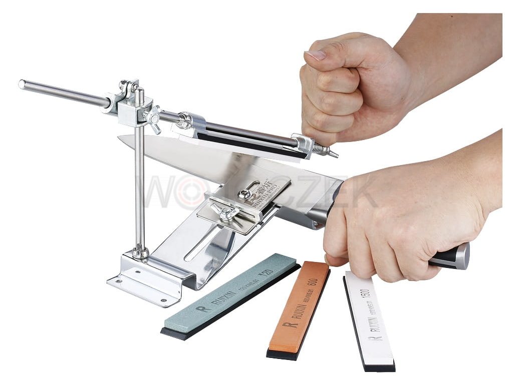 Zestaw ostrzałek do precyzyjnego ostrzenia. Doskonale sprawdza się zarówno w zastosowaniach kuchennych jak i militarnych. Zawiera kamienne ostrzałki o różnej ziarnistości, dzięki którym możemy uzyskać idealną powierzchnię ostrza. System pozwala na ostrzenie noży, dłut, tasaków i nożyczek. Zestaw zawiera cztery kamienie o gradacjach 120, 320, 600, 1500. System RUIXIN PRO III umożliwi każdemu perfekcyjne naostrzenie noża lub nożyczek niezależnie od umiejętności i doświadczenia. Wymuszenie kąta ostrzenia oraz cztery kamienie o różnej gradacji sprawiają, że każdy jest w stanie naostrzyć nóż jak profesjonalista.