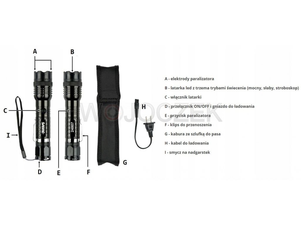 GŁÓWNE CECHY PRODUKTU: 1 000 000 Voltów - natychmiastowa samoobrona latarka z trzema trybami świecenia antypoślizgowa rękojeść kabura z mocowaniem do pasa klips do noszenia przy pasku niewielkie rozmiary, zawsze pod ręką