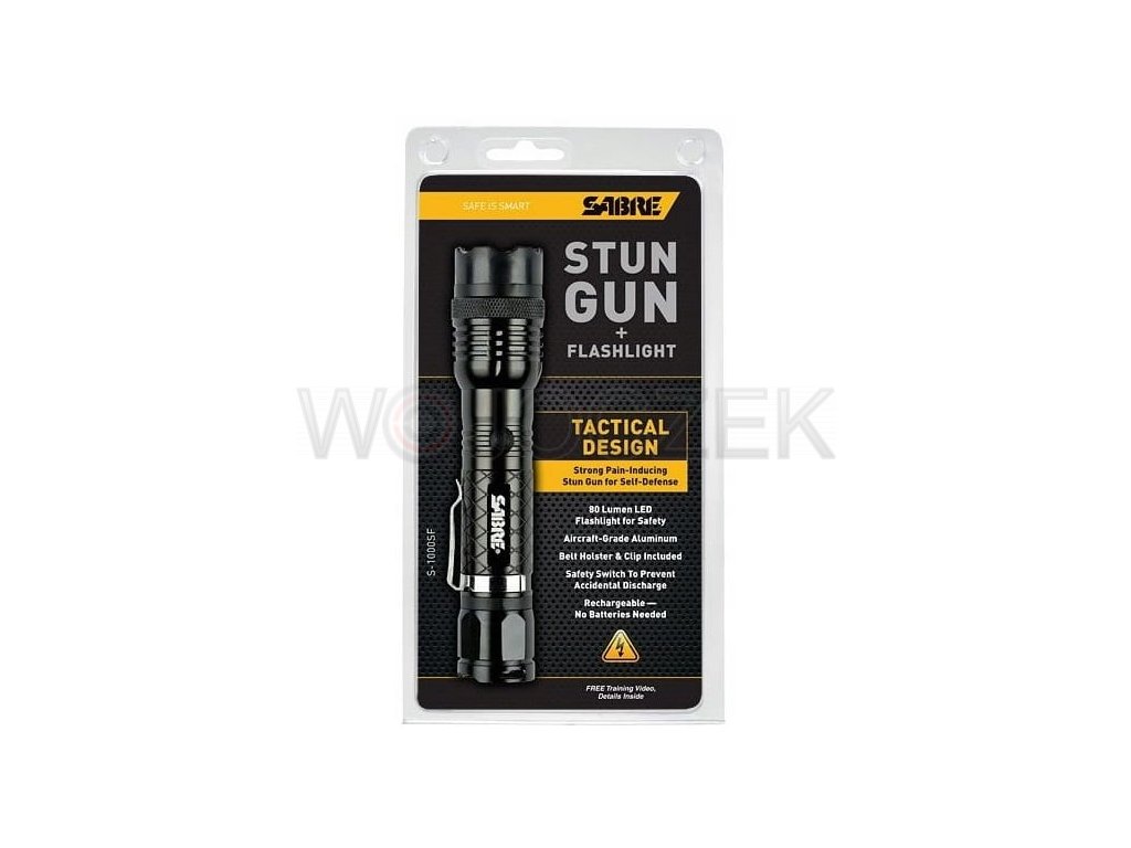 SABRE RED GS 1000SF to połączenie paralizatora i latarki ręcznej. Na obwodzie latarki znajdują się elektrody, które w razie potrzeby porażą prądem o mocy 1 miliona Volt. Latarka posiada diodę led o mocy 80 lumenów oraz 3 tryby świecenia: mocny, słaby, stroboskop. Paralizator jest bardzo prosty, a jednocześnie bezpieczny w obsłudze. Urządzenie posiada dwa przyciski, z których jeden służy do włączania latarki, a drugi do włączania paralizatora. Dodatkowo z tyłu na obudowie znajduje się przycisk ON/OFF, który zabezpiecza przed przypadkowym porażeniem. Jedną z najważniejszych zalet tego modelu jest wbudowany akumulator, który zapewnia bezproblemowe i ekonomiczne użytkowanie. PRODUKT DOSTĘPNY BEZ ZEZWOLENIA Polecany szczególnie kobietom, przedsiębiorcom, taksówkarzom, strażnikom, agentom ochrony, sprzedawcom, pracownikom stacji benzynowych, restauracji i barów. Zestaw zawiera: paralizator GS 1000SF, pokrowiec, klips, kabel do ładowania, smycz, oryginalne pudełko.