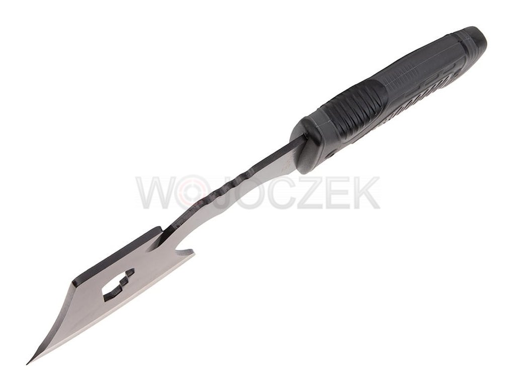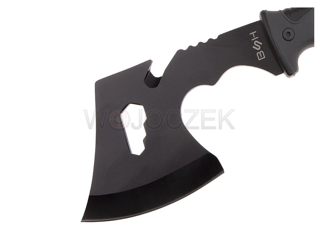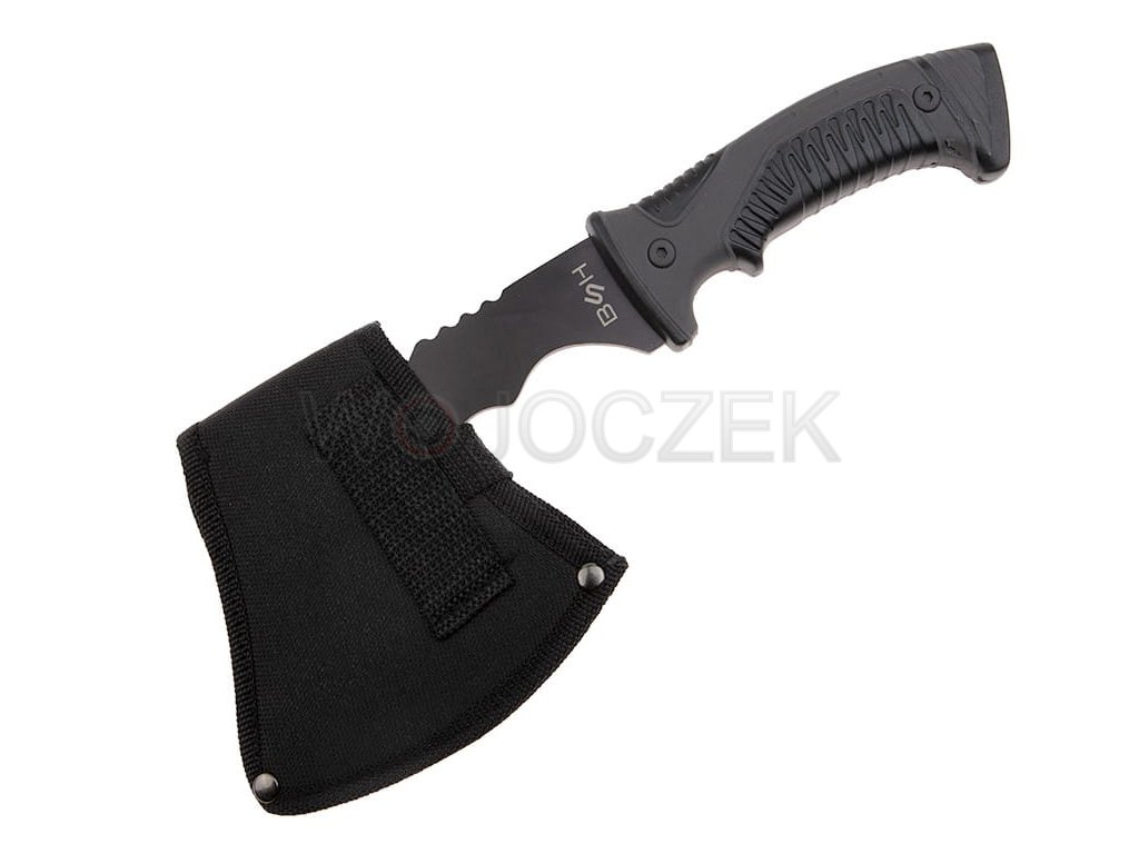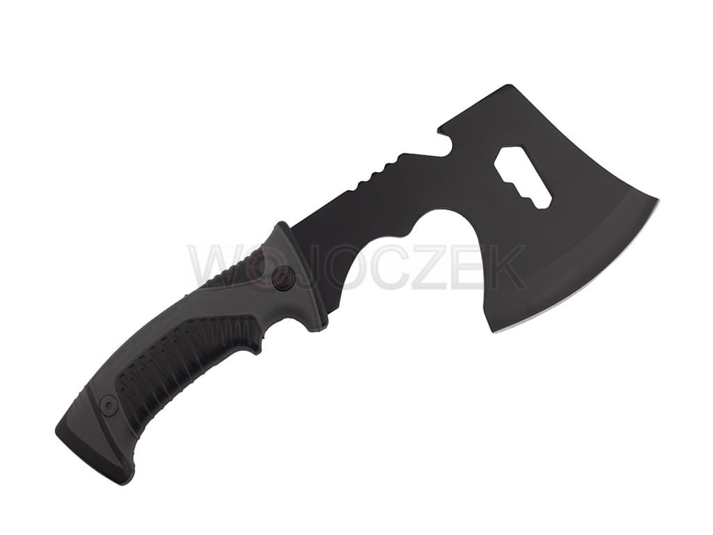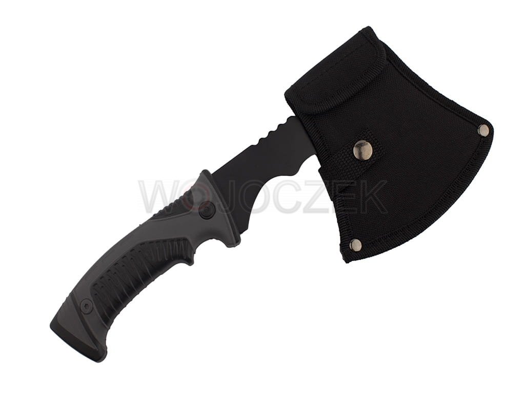 Poręczny, niewielki toporek do zadań specjalnych. Będzie idealnym narzędziem podczas wypraw, biwaków czy obozów survivalowych. Zajmuje niewiele miejsca, więc bez problemu zmieści się w każdym plecaku, a przytroczony do paska lub kamizelki nie będzie ciążył, ani przeszkadzał. Toporek survivalowy posiada konstrukcję typu hidden tang, czyli wykonany został z jednego kawałka grubej stali nierdzewnej 420. Taka budowa jest niezwykle solidna i gwarantuje wyjątkową odporność na ewentualne uszkodzenia. Głownia została dodatkowo pokryta czarną powłoką ochronną, która zabezpiecza przed korozją oraz niweluje efekt odblasku. Siekierka została wyposażona w zestaw kluczy oczkowych oraz ostrze do cięcia żyłek i lin. Doskonale nadaje się jako toporek do rzucania, którym miota się wyjątkowo łatwo i celnie. Antypoślizgowa, ergonomiczna rękojeść została wykonana z tworzywa gumopodobnego, które nawet podczas złych warunków atmosferycznych świetnie trzyma się ręki. Praca nim jest wyjątkowo komfortowa i nie nadwyręża ręki. Toporek taktyczny posiada czarny pokrowiec na ostrze, który można przymocować do paska spodni. Świetne narzędzie do ścinania drzewek, budowy obozu i innych plenerowych prac.