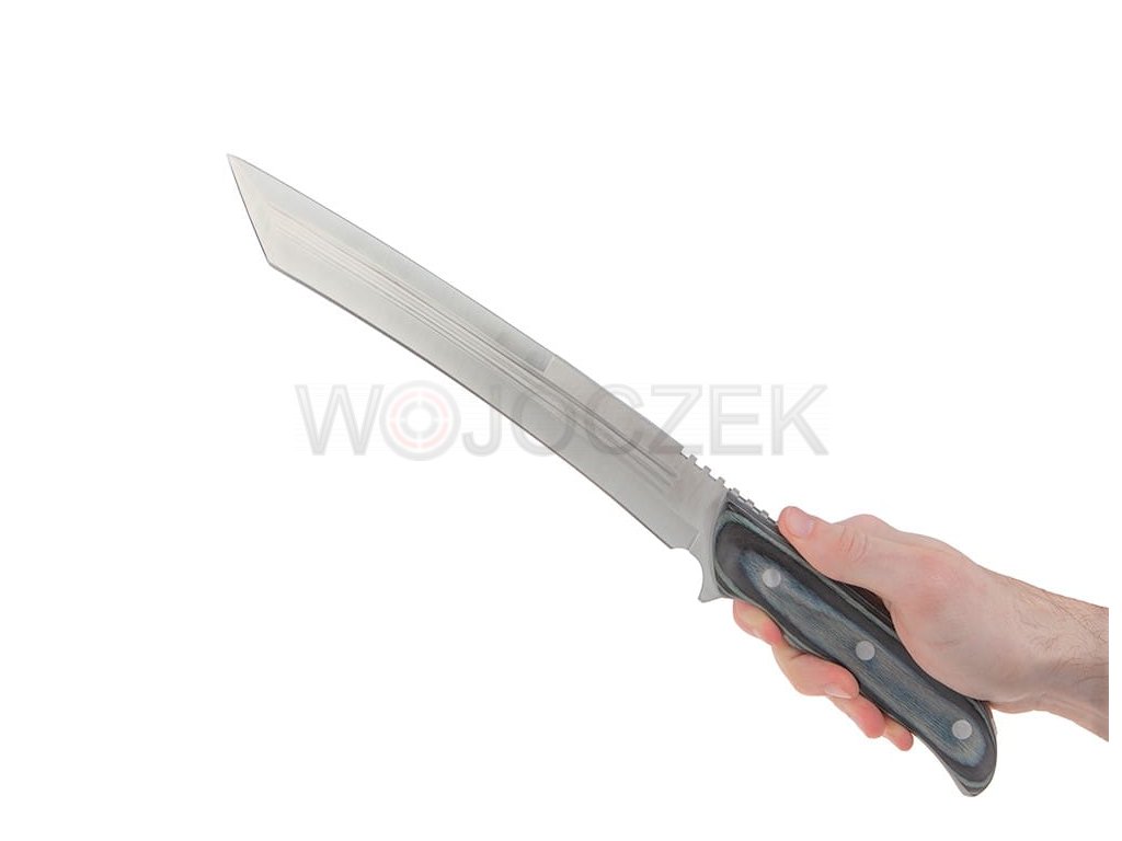 NÓŻ MYŚLIWSKI - MACZETA TANTO N-635E Wyjątkowo potężny, ogromny nóż myśliwski inspirowany japońską bronią Tanto. Noże tego typu charakteryzują się “ułamaną” głownią, która tworzy niezwykle ostre załamanie. Model N-635E posiada aż 45 centymetrów długości, co sprawia, że podchodzi on pod kategorię maczety. Kolosalny nóż będzie idealny do cięcia, rąbania i karczowania podczas plenerowych wypraw, biwaków czy survivalu. Posiada konstrukcję typu Full Tang, która jest bardzo solidna i nadaje mu ogromnej odporności. Wewnętrzny monolit tworzący szkielet noża został wykonany z wysokogatunkowej stali nierdzewnej 440. Materiał ten wykazuje wysokie właściwości antykorozyjne, które są niezbędne do pracy na zewnątrz. Głownia o wspomnianym profilu Tanto jest doskonała do pchnięć, cięć i zamachów. Ergonomicznie profilowana rękojeść została wykonana z drewnianych okładzin. Doskonale układa się nawet w małej dłoni, pozwalając na mocny i stabilny chwyt. Na grzbiecie znajduje się wygodne karbowanie pod kciuk, przydatne podczas prac wymagających użycia większej siły nacisku. W zestawie znajduje się brązowa kabura ze skóry, którą łatwo można przymocować do paska spodni. Nóż myśliwski Tanto to niezawodne, wzbudzające szacunek narzędzie do zadań specjalnych.