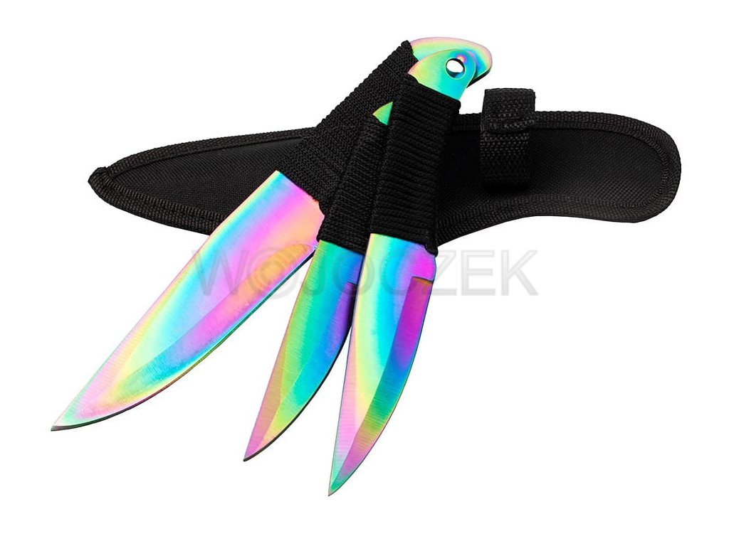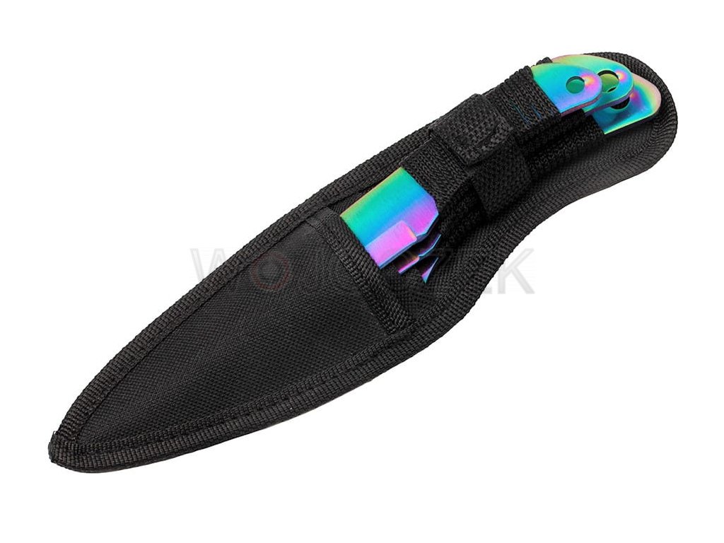Solidnie wykonany i rewelacyjnie wyglądający zestaw noży do rzucania. Oksydowane na specjalny wielobarwny kolor (Rainbow Fade) wyglądają spektakularnie. Posiadają konstrukcję typu Full Tang, która gwarantuje maksymalną wytrzymałość i odporność. Monolity zostały wykonane z wysokojakościowej stali nierdzewnej typu 420. Każda głownia posiada profil typu trailing point z gładkim ostrzem. Rękojeści zostały wykonane z materiałowego oplotu, który zapewnia doskonałą przyczepność do ręki. Noże są świetnie wyważone, a co za tym idzie posiadają doskonałe właściwości aerodynamiczne. Trening nimi to fantastyczne ćwiczenie koordynacji oko-ręka, oceny odległości, celności i techniki rzutu. W zestawie znajduje się czarny pokrowiec z cordury, który można przymocować do paska spodni.