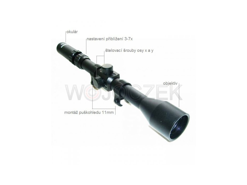 Puškohled nejen na vzduchovku s přiblížením 3-7x. Ruční zoom. Průměr čočky 28 mm. Montáž na 11 mm rybinu.