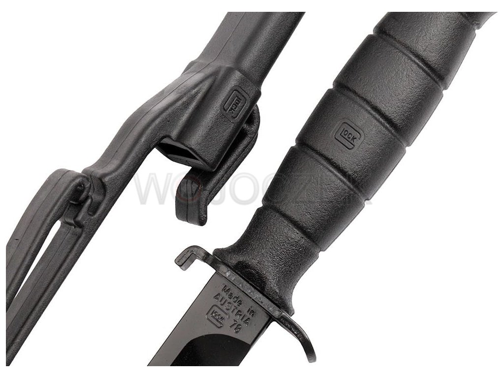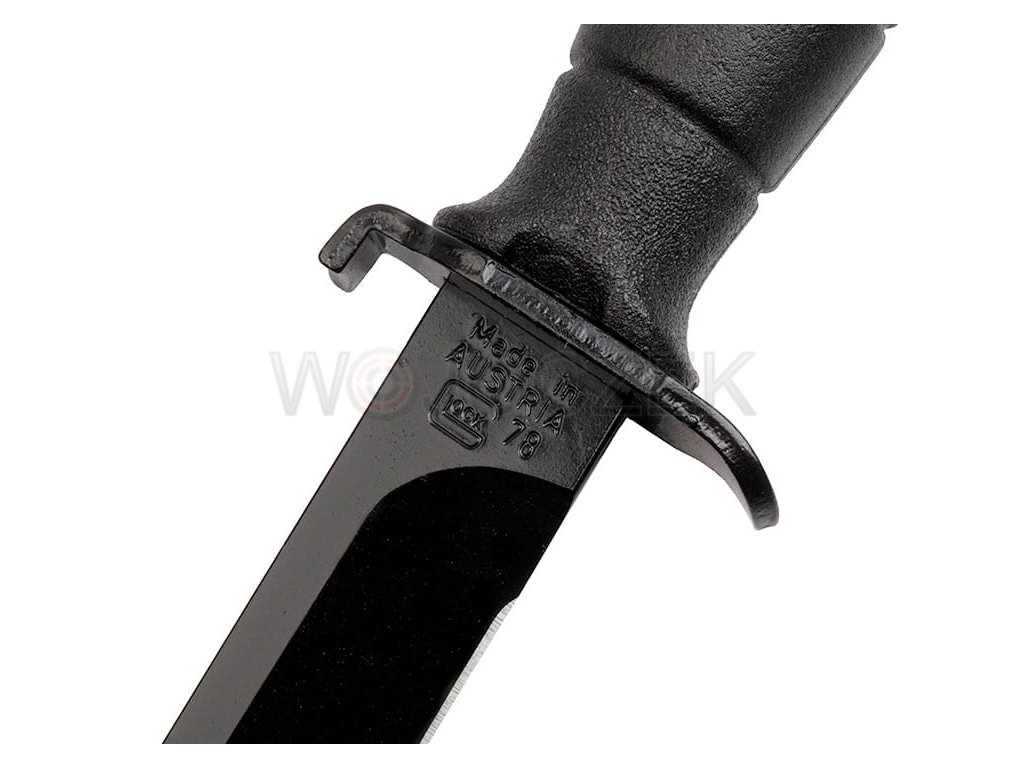 ÚTOČNÝ NŮŽ GLOCK 78 ČERNÝ. Řada nožů Glock byla vyvinuta v roce 1975 rakouskou společností Glock. Jen o rok později, v roce 1976, se stal oficiálním útočným nožem rakouské armády. Dodnes jej používá mnoho jednotek po celém světě (včetně polské armády). Dnes je legendou a dychtivě si jej kupují vojáci i civilisté. Glock 78 má jednoduchý design, je dobře vyvážený a extrémně odolný. Čepel je vyrobena z tlusté, černěné nerezové oceli. Rukojeť je vyrobena z tvrdého polymeru, stejného materiálu, jaký se používá k výrobě pistolí Glock. Kovový chránič chrání ruku před neúmyslným sklouznutím na čepel. Jedna strana chrániče slouží jako otvírák na lahve. Pouzdro je vyrobeno ze stejného polymeru jako rukojeť. Má silnou sponu, která zabraňuje vyklouznutí nože. Spona na opasek je navržena tak, aby se dala rychle zapnout, aniž by bylo nutné ji provlékat celým opaskem. Doporučuje se pro survival výlety a sběratele.