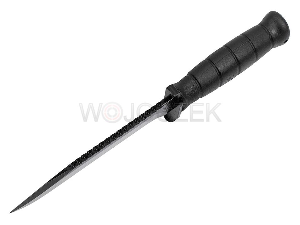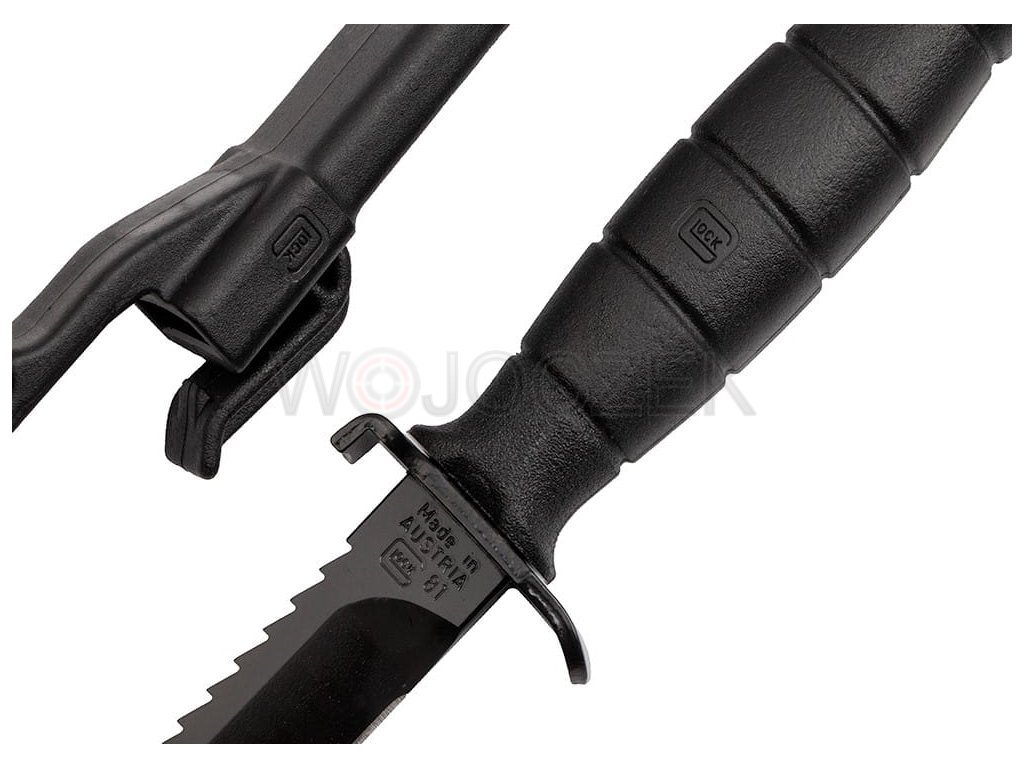 ČERNÝ ÚTOČNÝ NŮŽ GLOCK 81. Řada nožů Glock byla vyvinuta v roce 1975 rakouskou společností Glock. Jen o rok později, v roce 1976, se stala oficiálním útočným nožem rakouské armády. Dodnes ji používá mnoho jednotek po celém světě (včetně polské armády). Dnes si ji jako legendu s nadšením kupují vojáci i civilisté. Glock 81 má jednoduchou konstrukci, je dobře vyvážený a extrémně odolný. Čepel je vyrobena z tlusté, černěné nerezové oceli. Na horní části čepele je umístěna vysoce účinná dvouřadá pilka, která umožňuje řezat i silné větve. Rukojeť je vyrobena z tvrdého polymeru, stejného materiálu, jaký se používá k výrobě pistolí Glock. Kovový chránič chrání ruku před nekontrolovaným sklouznutím na čepel. Jedna strana chrániče slouží jako otvírák na lahve. Pouzdro je vyrobeno ze stejného polymeru jako rukojeť. Má pevnou sponu, která zabraňuje sklouznutí nože. Spona na opasek je navržena pro rychlé zapnutí bez nutnosti provlékání celým opaskem. Doporučeno pro survival výlety a sběratele.