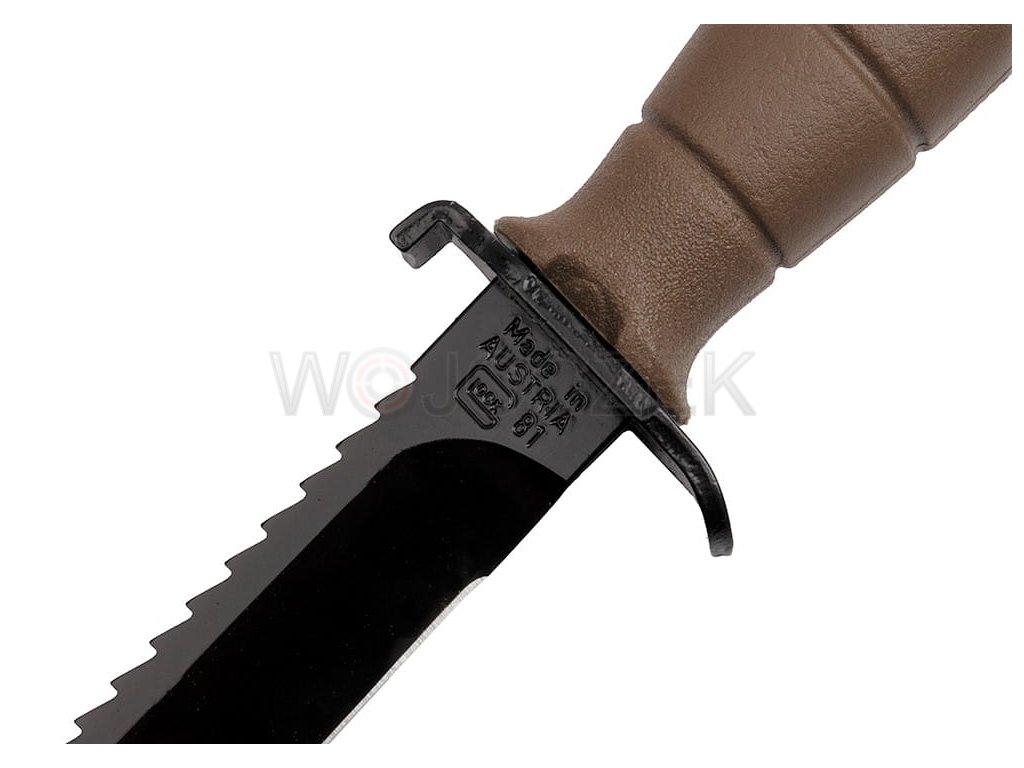 ÚTOČNÝ NŮŽ GLOCK 81 FLAT DARK EARTH. Řada nožů Glock byla vyvinuta v roce 1975 rakouskou společností Glock. O pouhý rok později, v roce 1976, se stal oficiálním útočným nožem rakouské armády. Dodnes jej používá mnoho jednotek po celém světě (včetně polské armády). Dnes si jej jako legendu dychtivě kupují vojáci i civilisté. Glock 81 má jednoduchou konstrukci, je dobře vyvážený a extrémně odolný. Čepel je vyrobena z tlusté, černěné nerezové oceli. Na horní části čepele je vysoce účinná dvouřadá pila, která umožňuje řezat i silné větve. Rukojeť je vyrobena z tvrdého polymeru, stejného materiálu, jaký se používá k výrobě pistolí Glock. Kovový chránič chrání ruku před nekontrolovaným sklouznutím na čepel. Jedna strana chrániče slouží jako otvírák na lahve. Pouzdro je vyrobeno ze stejného polymeru jako rukojeť. Má pevnou sponu, která zabraňuje vyklouznutí nože. Spona na opasek je navržena pro rychlé zapnutí bez nutnosti provlékání celým opaskem. Doporučeno pro výlety za přežitím a sběratele.